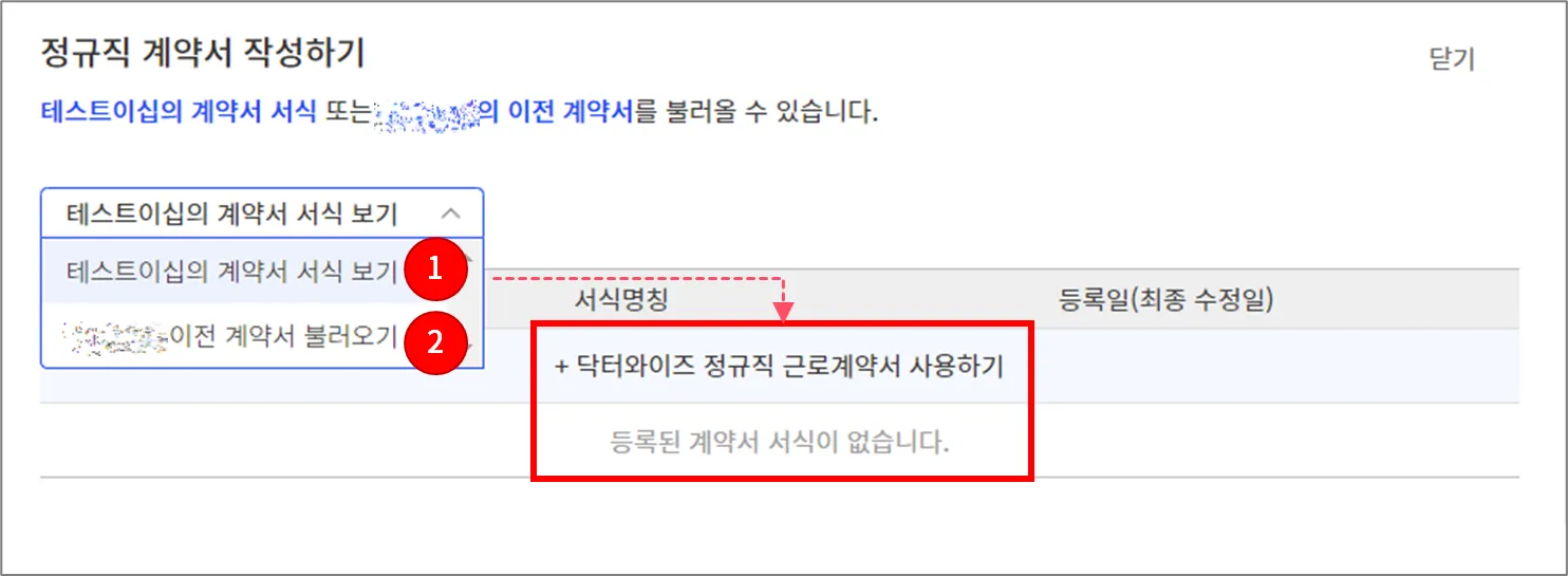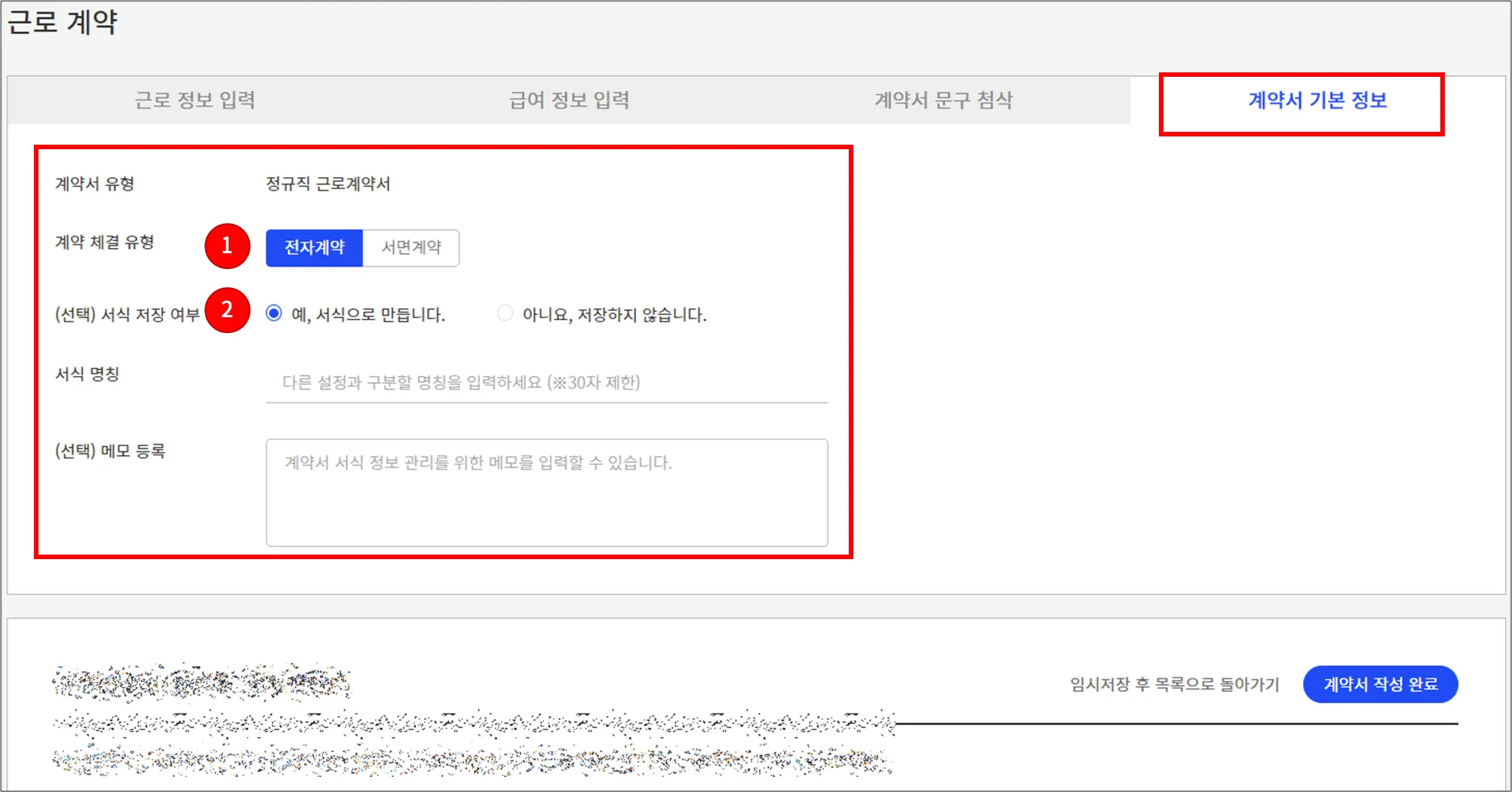 기본 제공 계약 서식 / 사용자가 직접 만든 서식 / 근로자의 이전 계약 서식 중 하나를 선택할 수 있습니다.