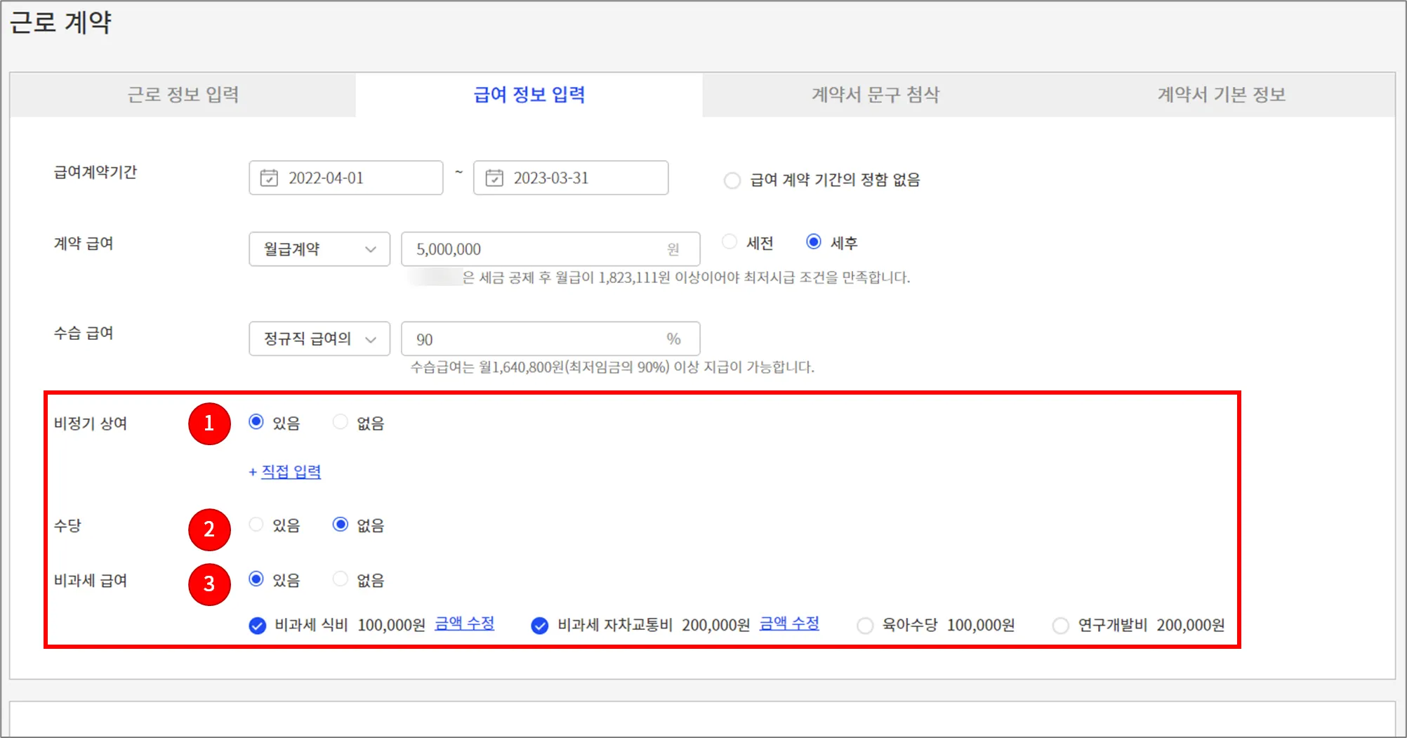 6. 비정기 상여 / 수당 / 비과세 급여가 있다면 입력하세요.