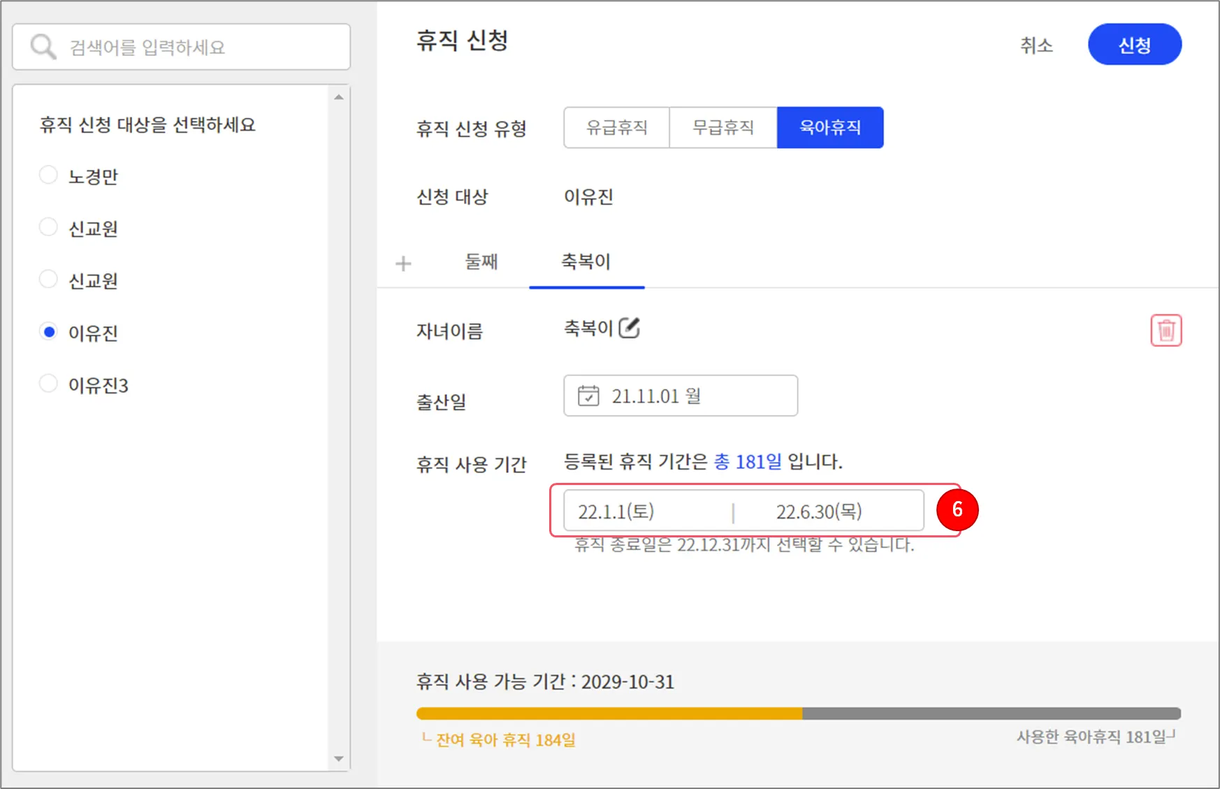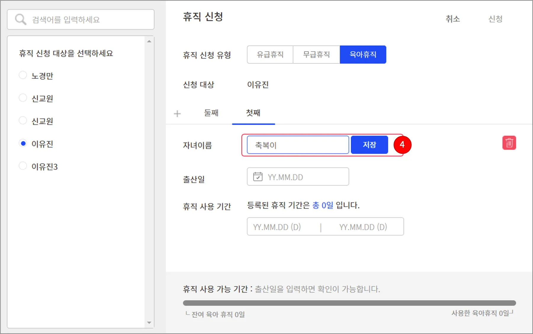 자녀의 출산일을 입력하면 휴직 사용 가능 기간이 표시됩니다.