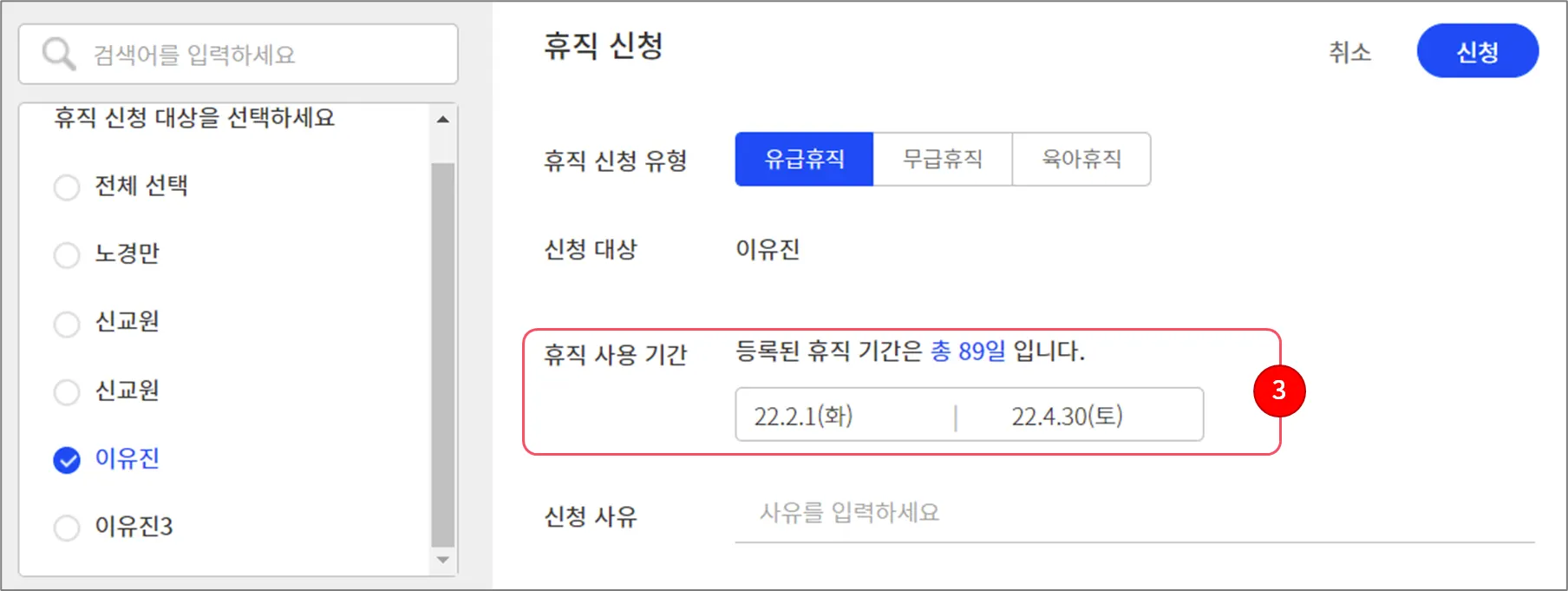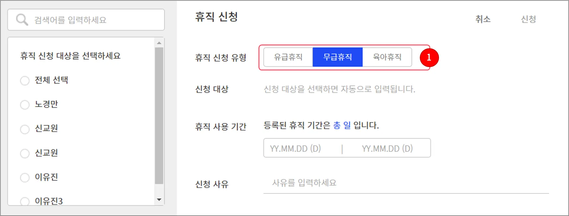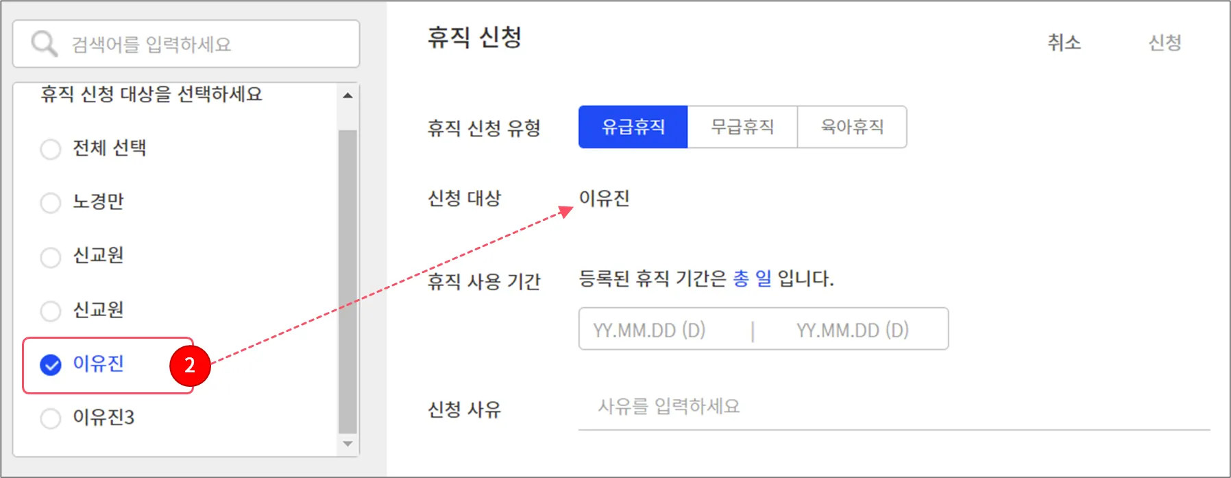 유급휴직을 등록할 근로자를 선택하세요. 여러 명을 선택할 수도 있습니다.