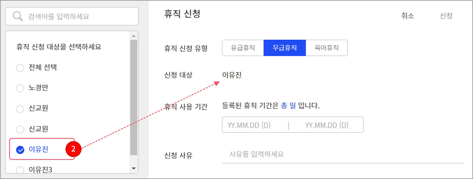 무급휴직을 등록할 근로자를 선택하세요. 여러 명을 선택할 수도 있습니다.