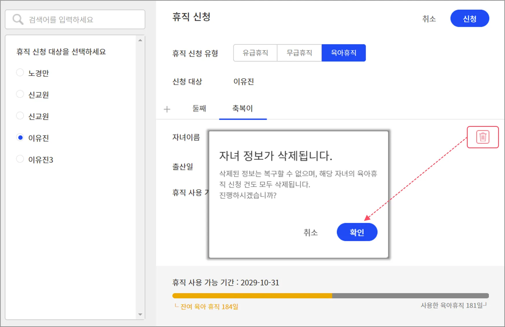 자녀별 육아휴직을 12개월 모두 사용할 수도 있고 분할 사용도 관리할 수 있습니다.