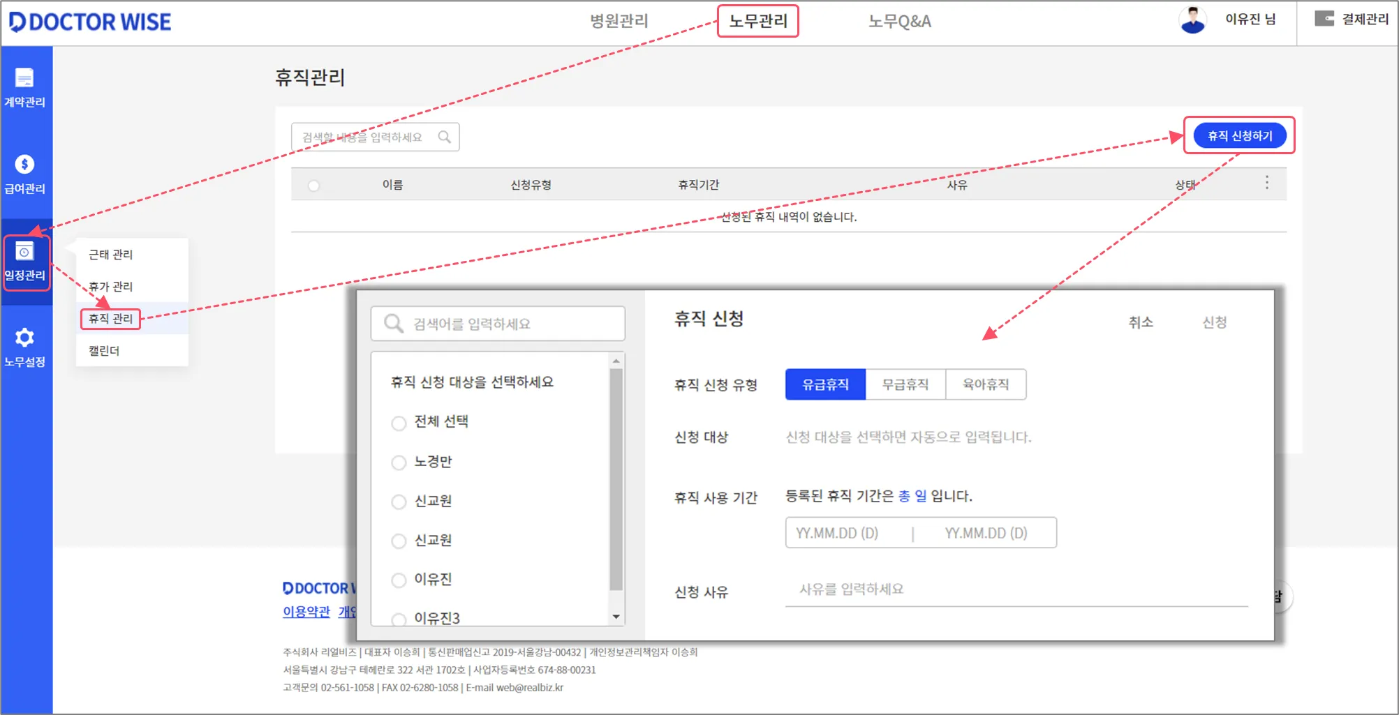 닥터와이즈는 근로자의 유급휴직, 무급휴직, 육아휴직을 손쉽게 관리할 수 있습니다.