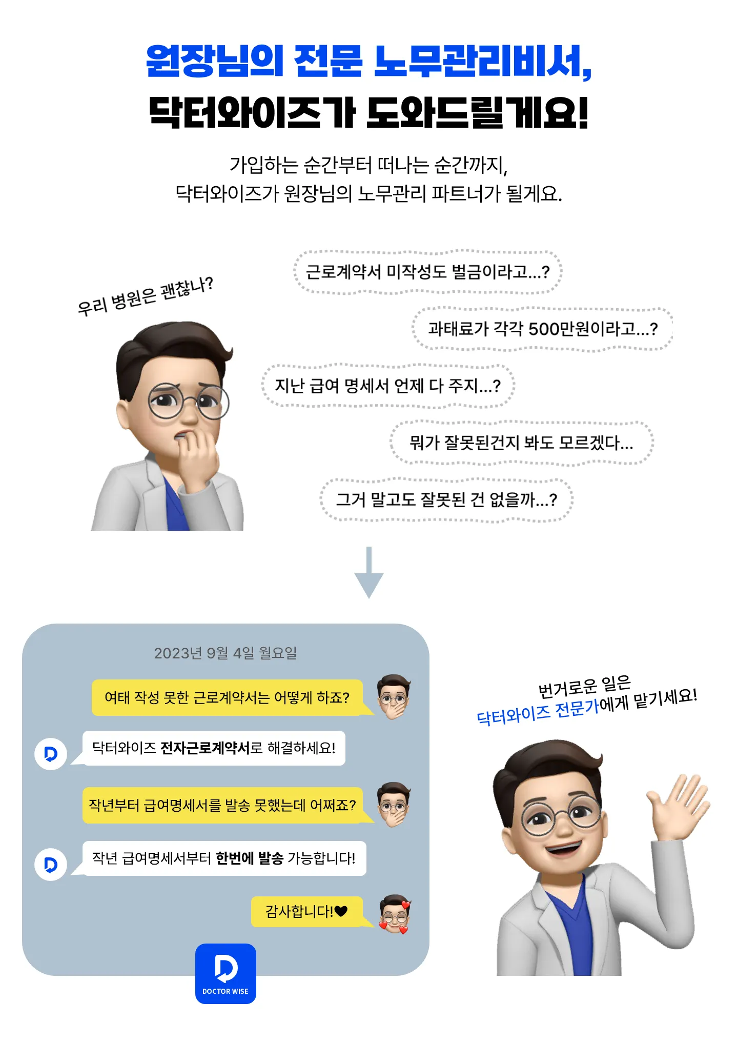 신규 가입 병원을 위한 특별 이벤트 지금 하단 버튼을 클릭하여 ‘급여명세서, 근로계약서 발급 신청하기’ 를 클릭하시면 전담 매니저가 1:1로 닥터와이즈 기본 세팅부터 현재 병원의 인사노무관리 현황까지 올인원으로 케어해드립니다! * 본 이벤트는 선착순 마감 시 임의 종료될 수 있습니다.