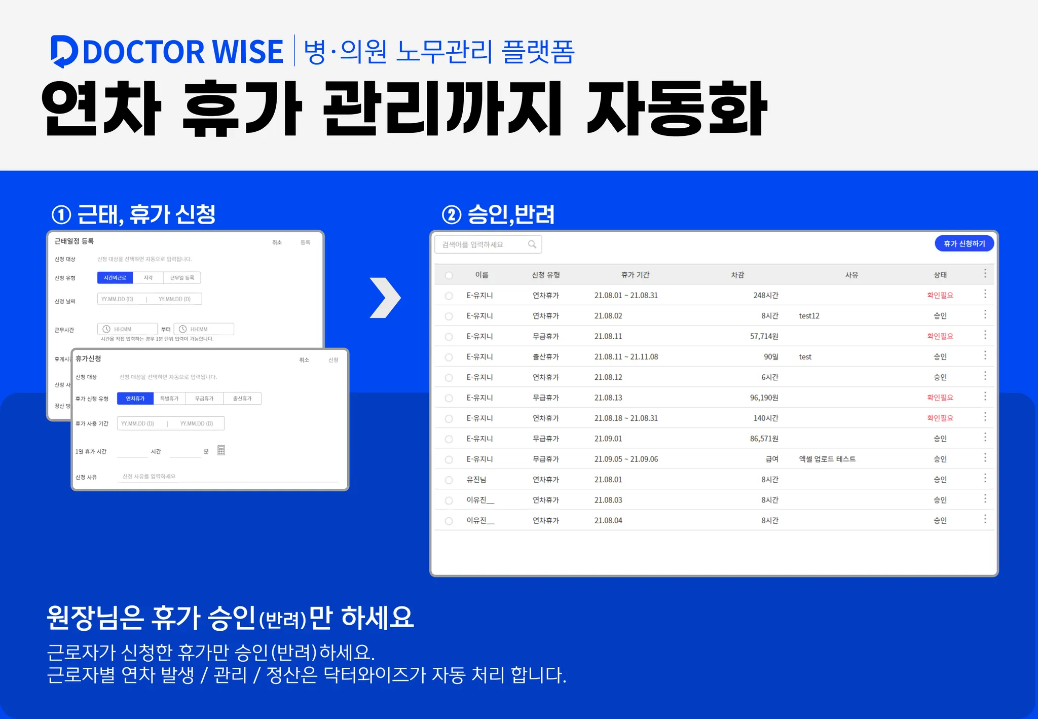 직원의 휴가 신청, 승인만 하세요. 잔여 연차, 수당 등은 닥터와이즈가 자동으로 계산합니다.