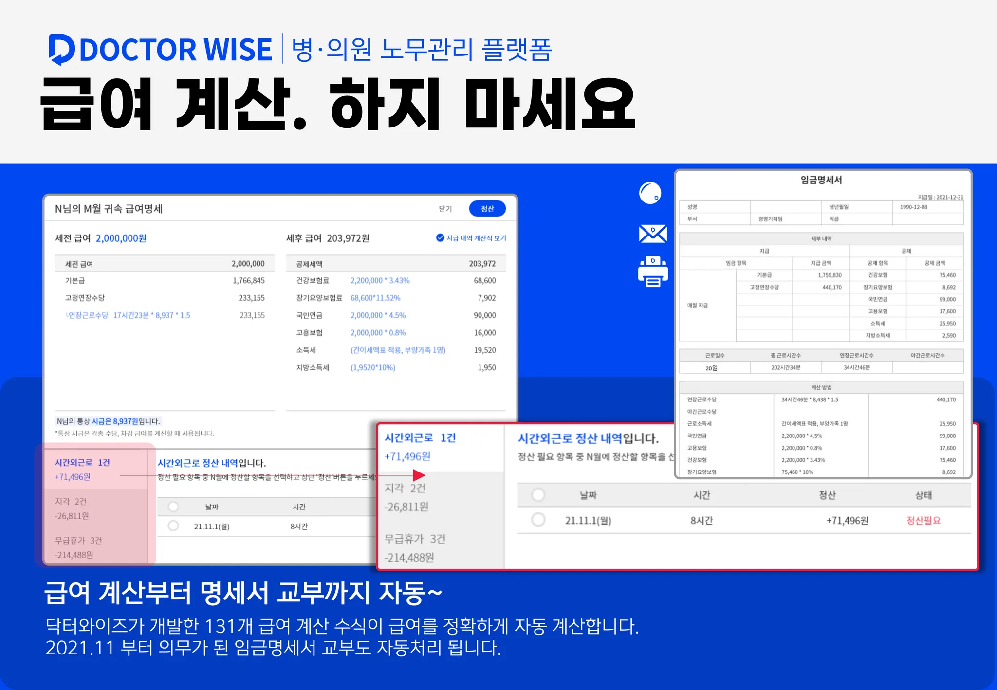 매번 급여 계산을 위해 인터넷에서 검색을 하고, 엑셀을 사용할 필요 없이 닥터와이즈 하나만으로 급여 계산부터 하나은행 이체, 급여명세서 발급까지 가능해요!
