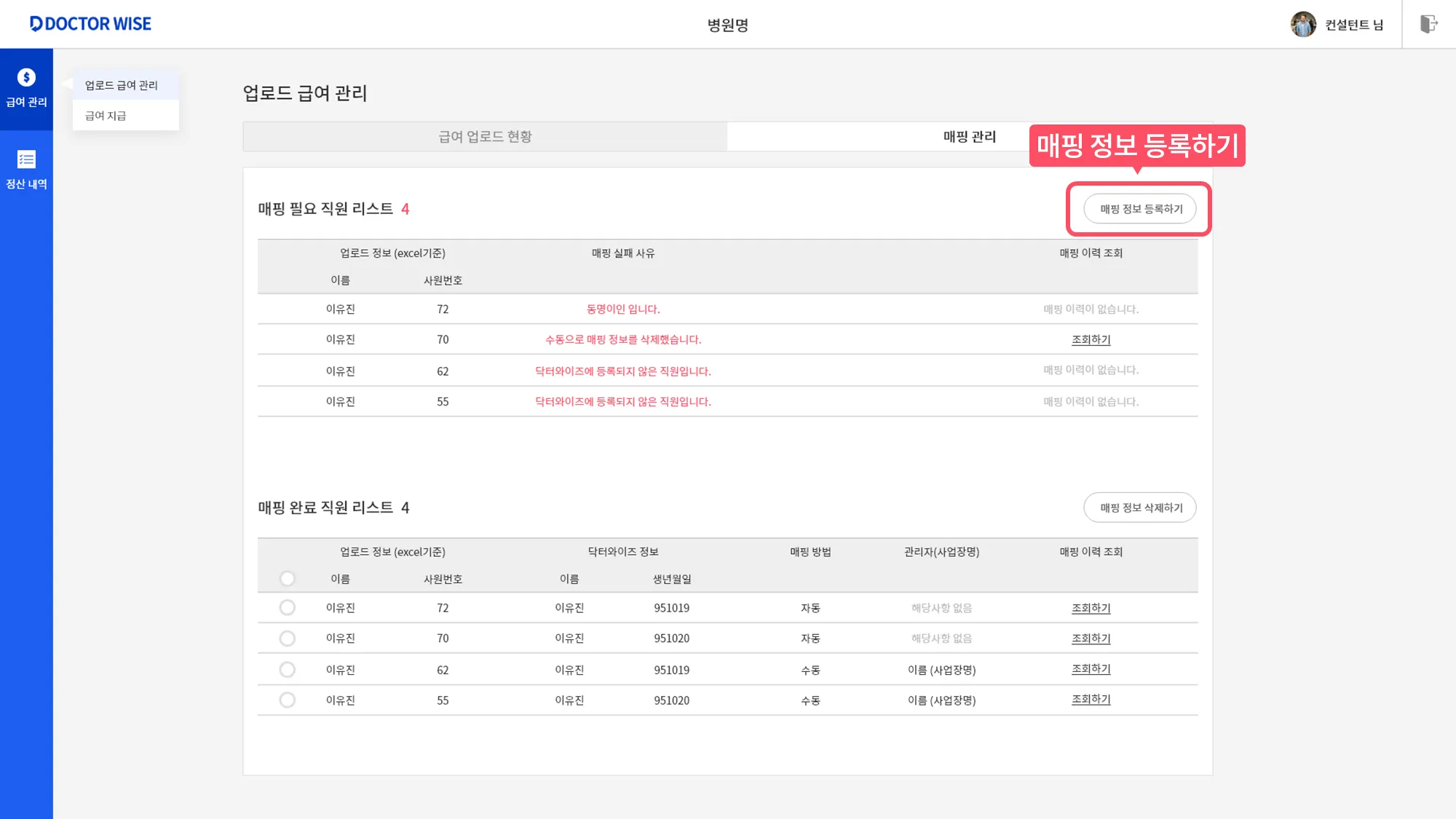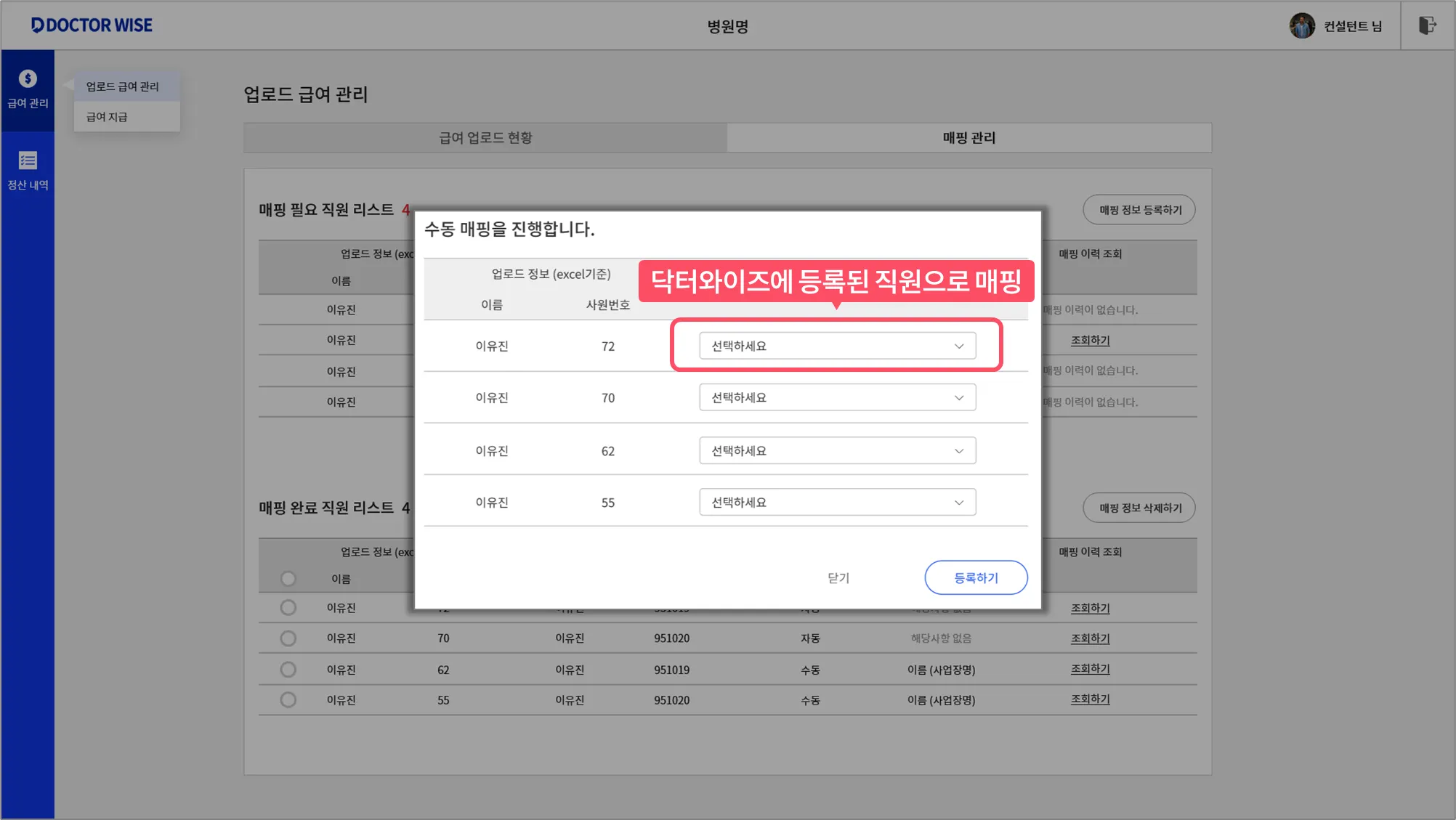닥터와이즈에 등록 된 직원 정보와 매핑 시켜주세요.