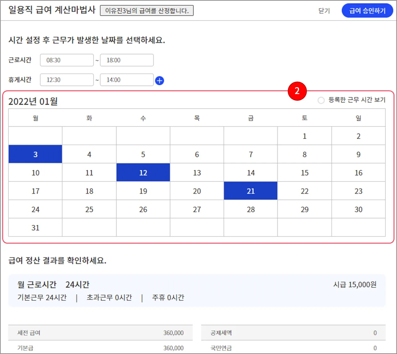 일용직 근무를 한 날짜를 선택하세요. 해당 날짜를 마우스로 클릭하면 됩니다.