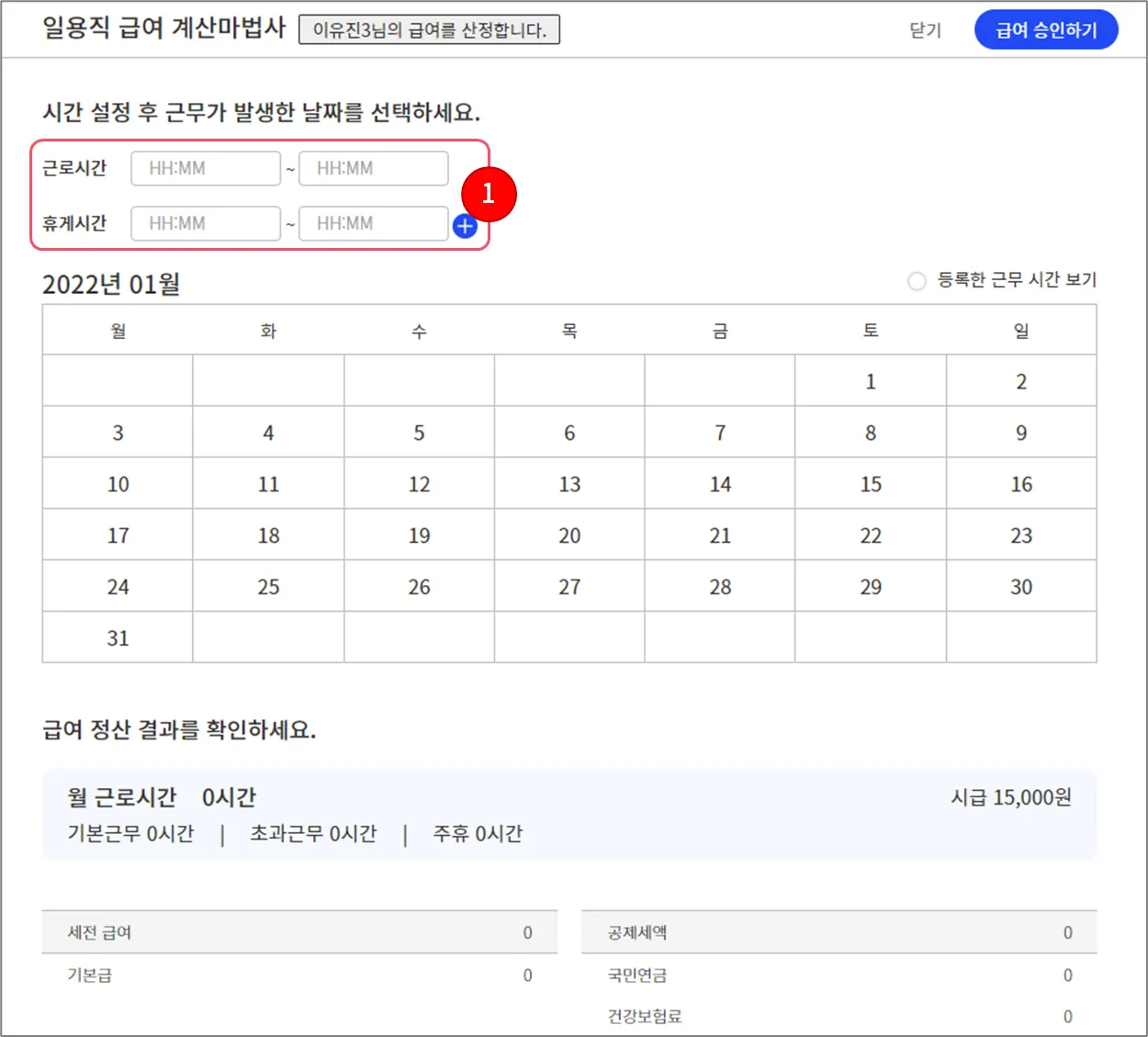 메뉴경로 : 급여관리 - 급여지급 - 지급 월 선택 - 일용직 근무 일정 등록