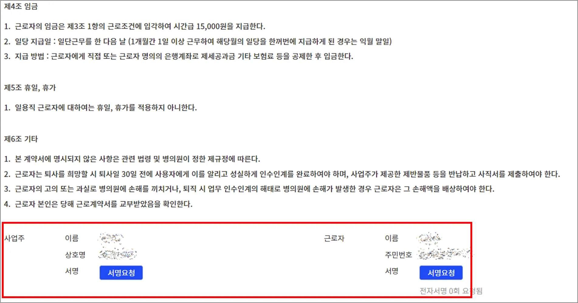 사업주와 근로자 각각 서명이 필요합니다.
