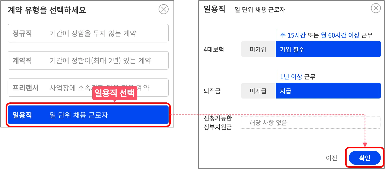 계약 유형을 일용직을 선택해주세요. 정규직 계약에 관한 안내 사항을 읽은 후 확인을 누르세요.