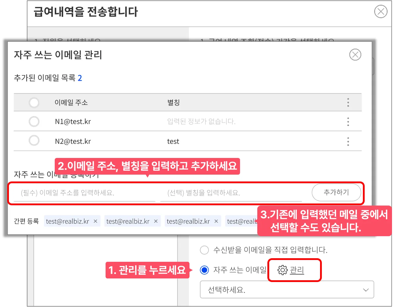 급여 자료를 자주 보내는 이메일 주소는 저장해서 사용할 수 있어요.