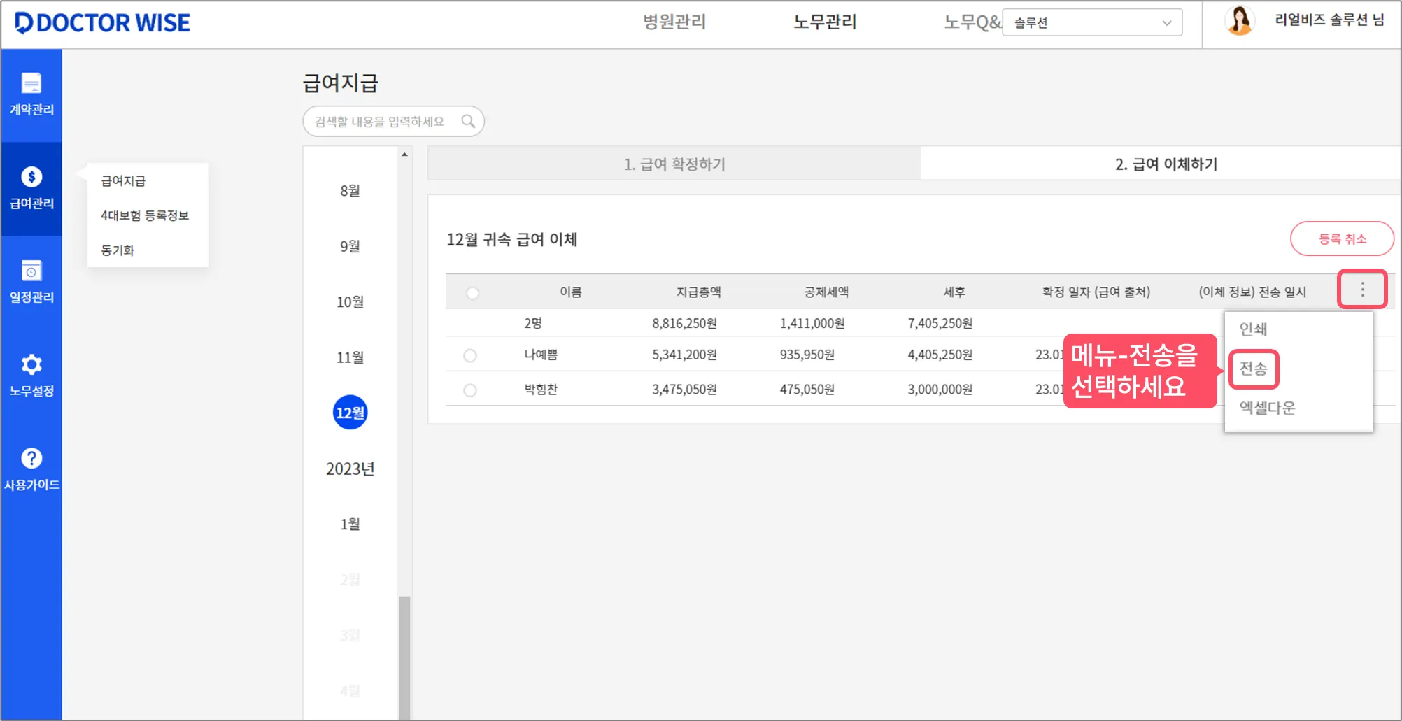 전체 급여 자료를 한 이메일(관공서, 세무법인 등)로 전송할 수도 있습니다.