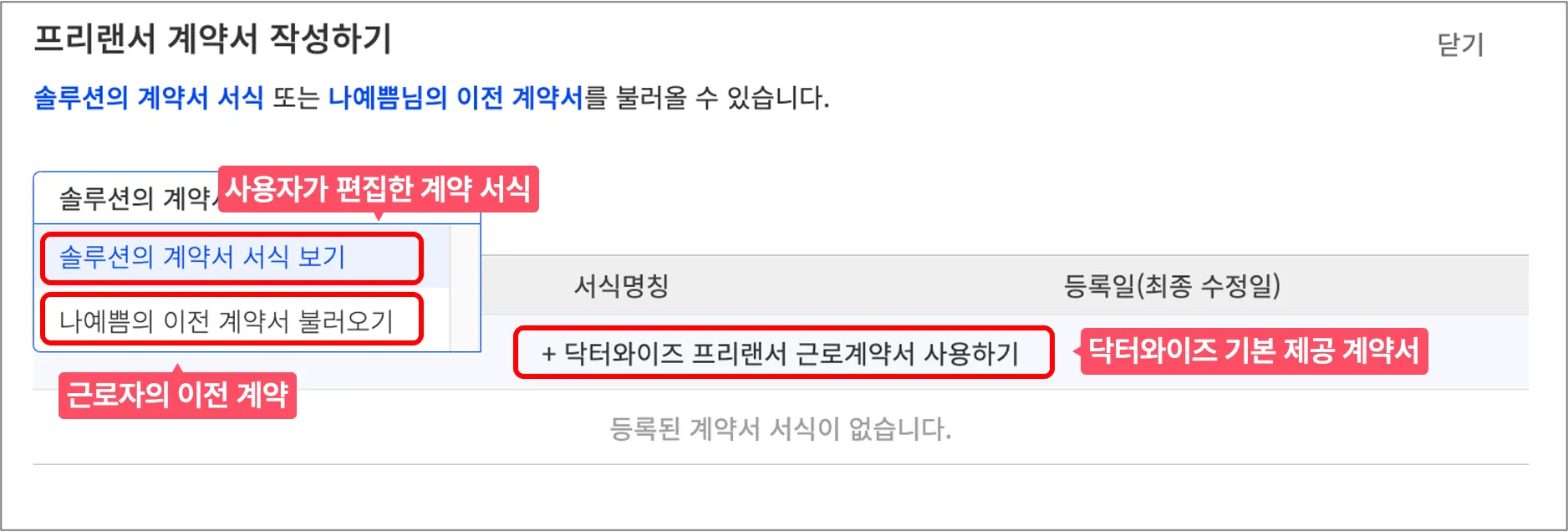 기본 제공 계약 서식 / 사용자가 직접 만든 서식 / 근로자의 이전 계약 서식 중 하나를 선택할 수 있습니다.