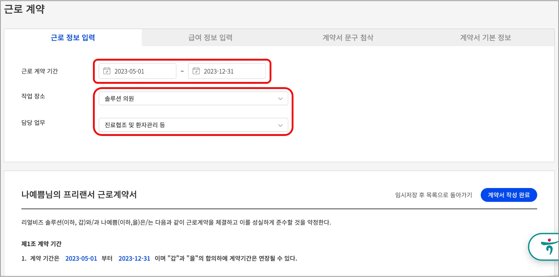 현재 작성하는 근로계약 내용을 편집할 수 있습니다.