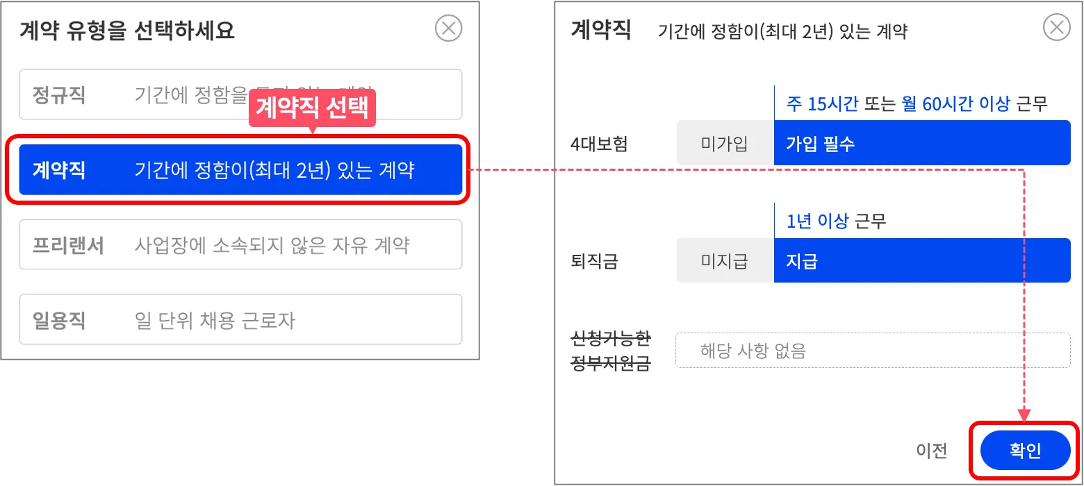 계약 유형을 계약직을 선택해주세요. 계약직에 관한 안내 사항을 읽은 후 확인을 누르세요.