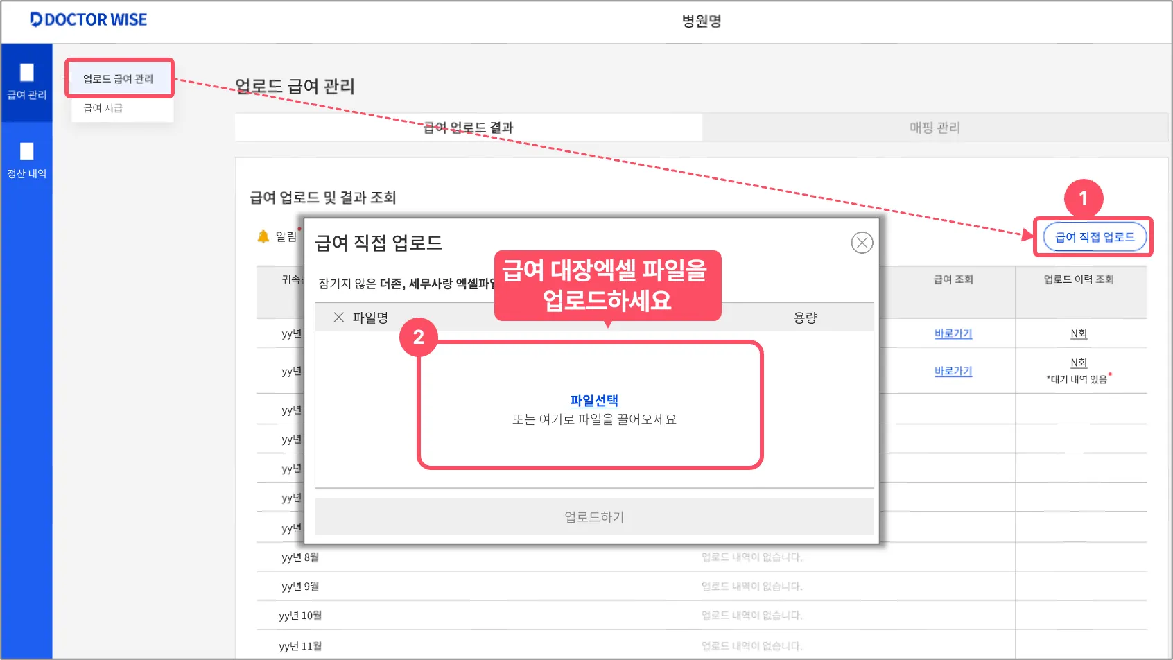 급여 대장 엑셀 파일을 직접 업로드 할 수 있습니다.