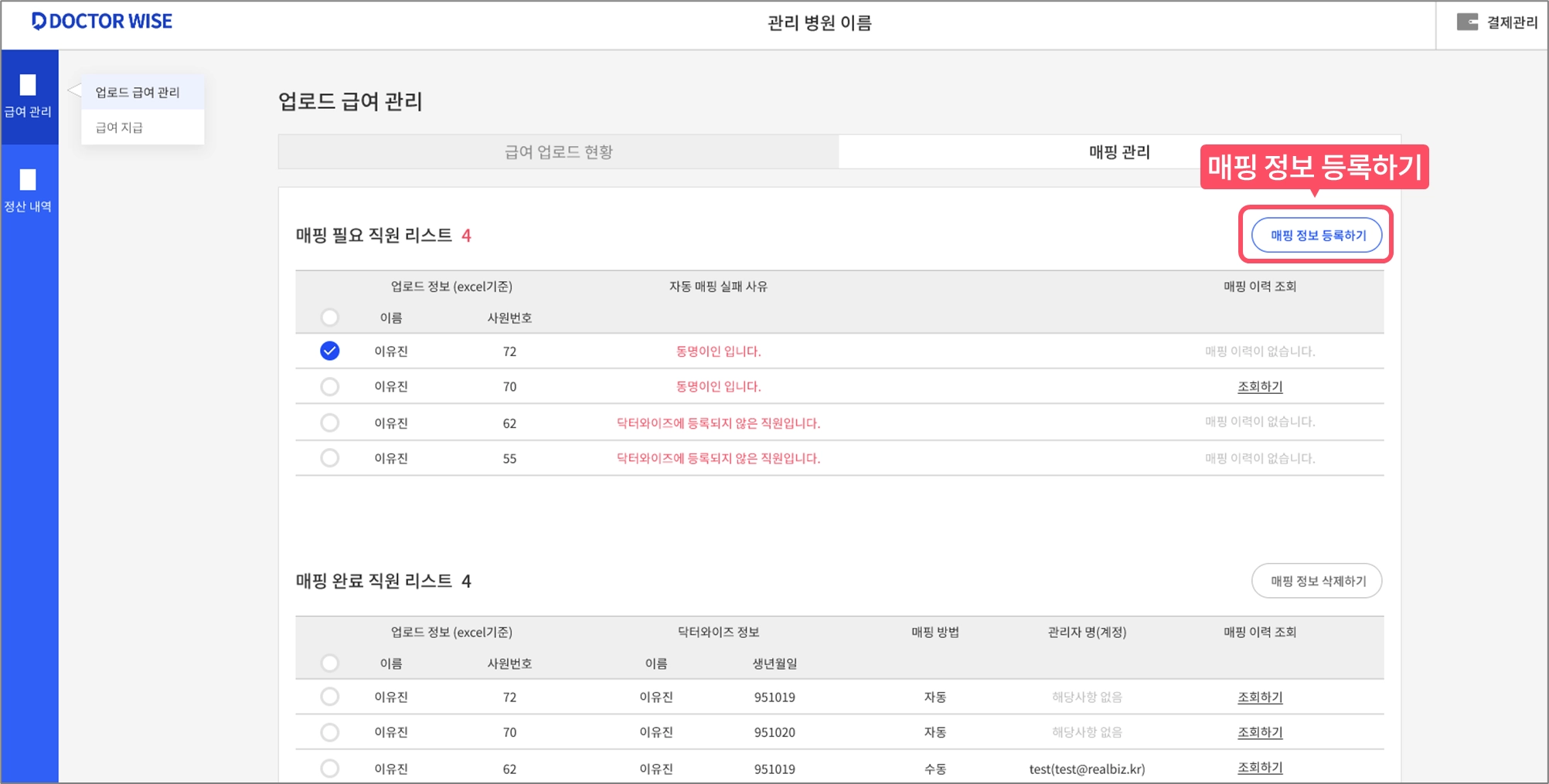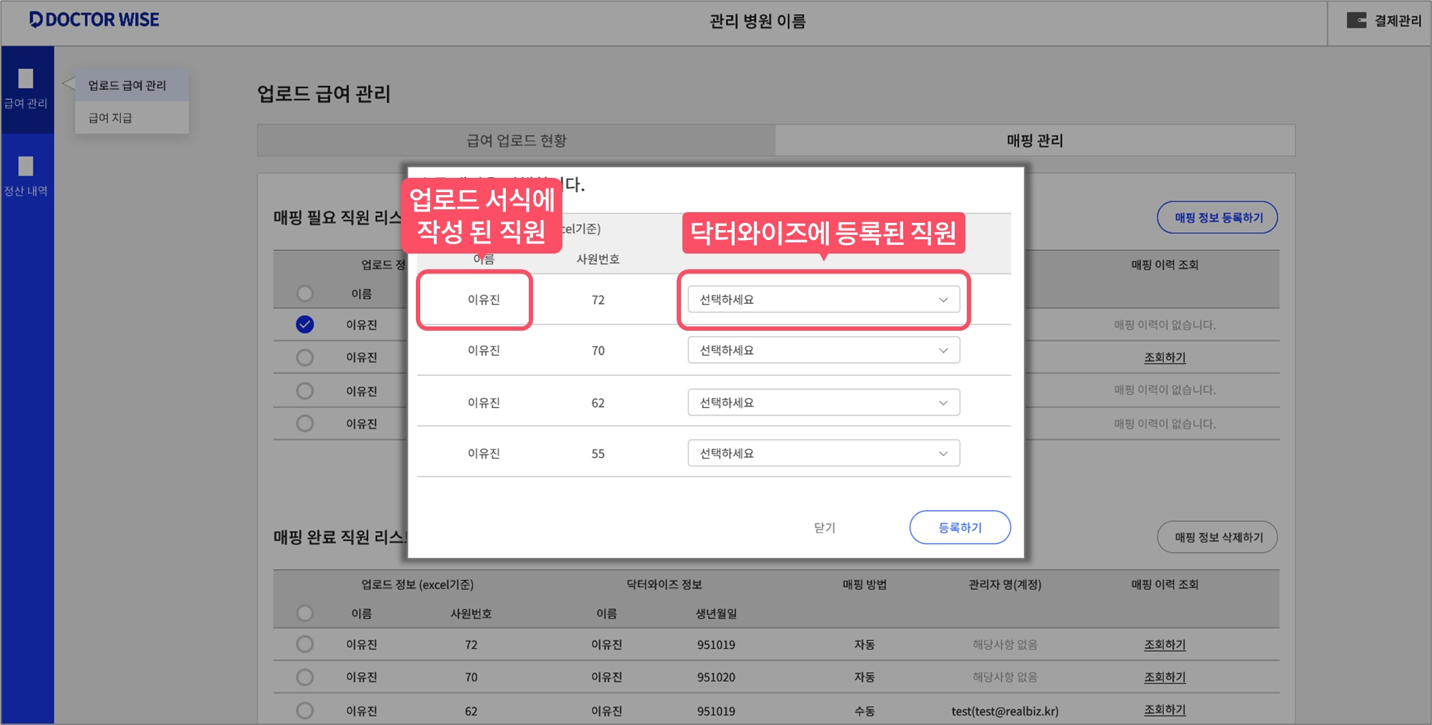 닥터와이즈에 등록 된 직원 정보와 매핑 시켜주세요.