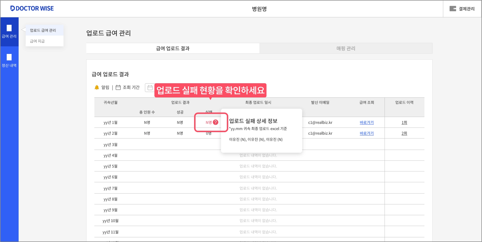 귀속 월의 업로드 실패 현황을 확인하세요.