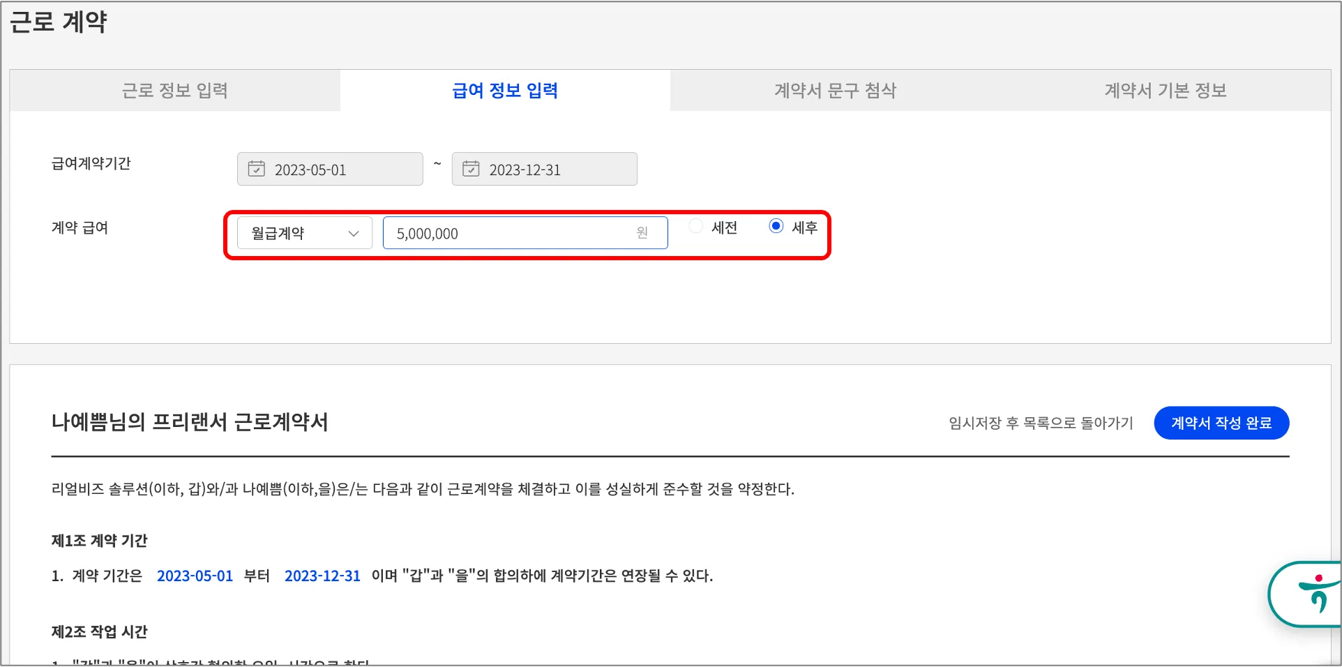 세금공제전(세전급여) / 세금공제후(네트제) 급여계약을 모두 지원합니다.