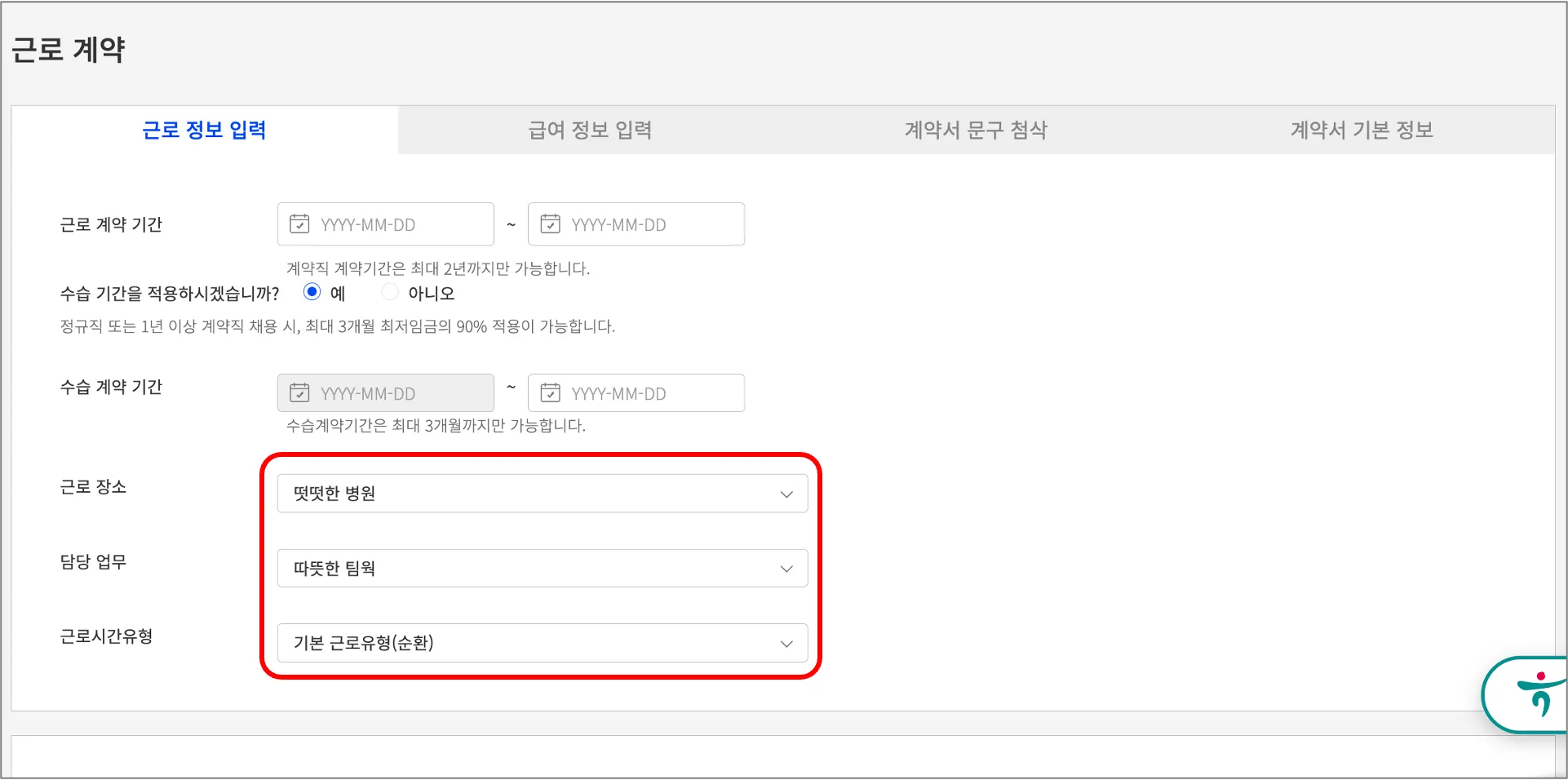 계약 유형을 계약직을 선택해주세요. 계약직에 관한 안내 사항을 읽은 후 확인을 누르세요.