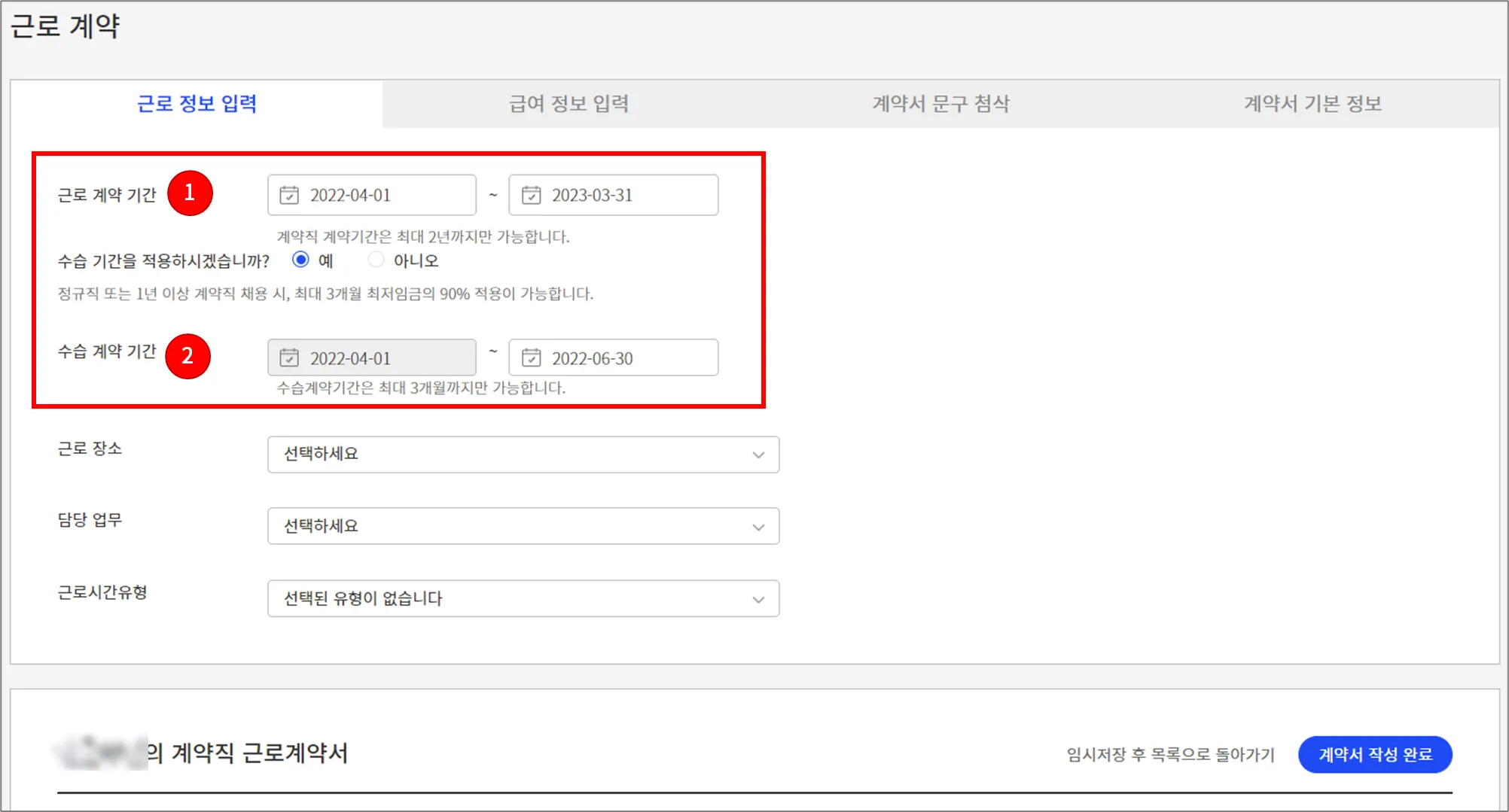 근로 계약 기간을 설정하세요. 계약직 계약 기간은 최대 2년 까지만 설정할 수 있습니다.