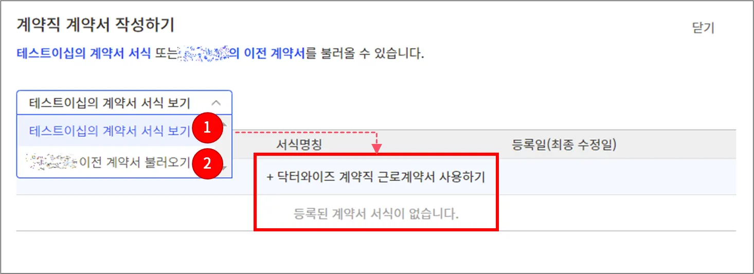기본 제공 계약 서식 / 사용자가 직접 만든 서식 / 근로자의 이전 계약 서식 중 하나를 선택할 수 있습니다.