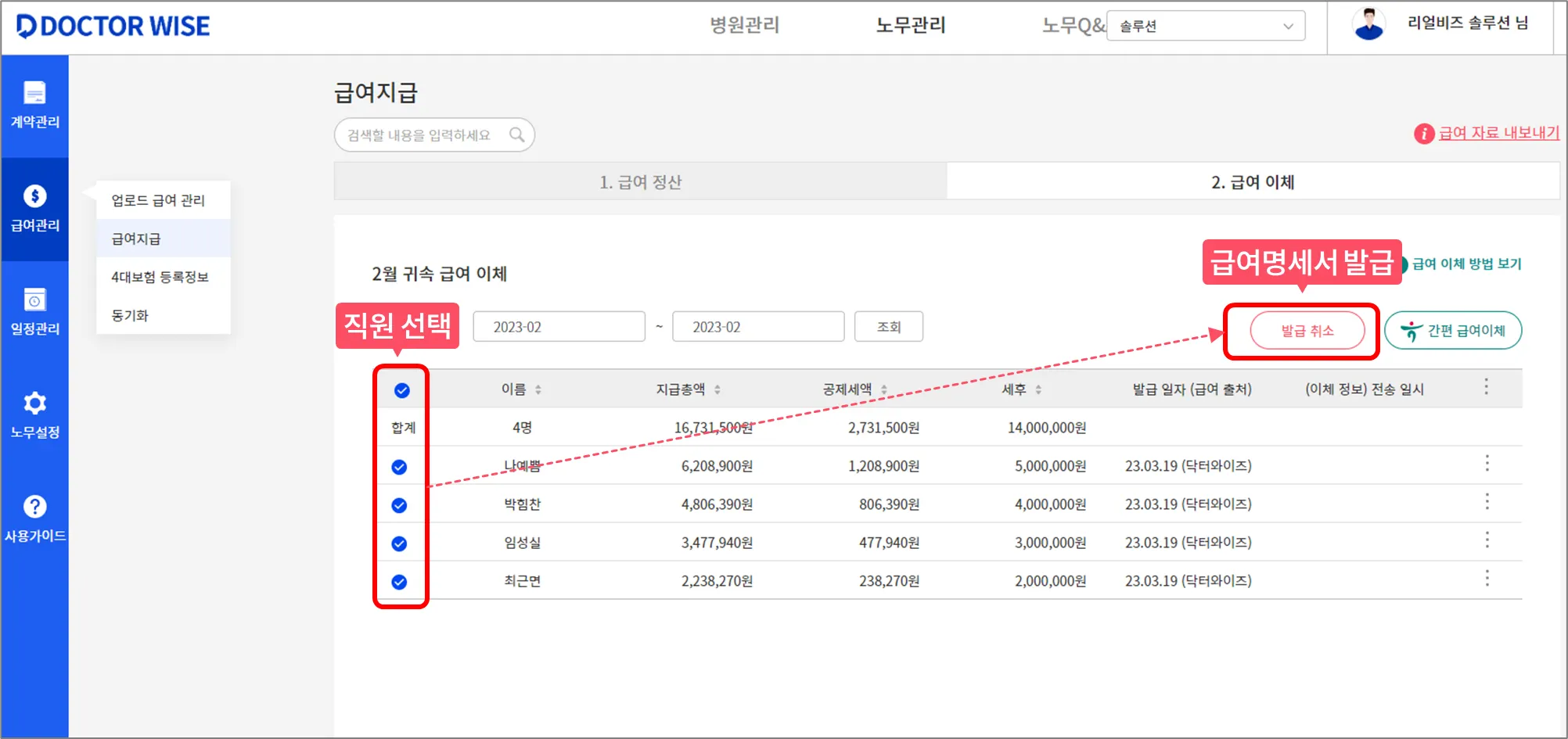 닥터와이즈는 손쉽게 급여명세서를 발급하고, 근로자가 로그인해서 확인할 수 있습니다.