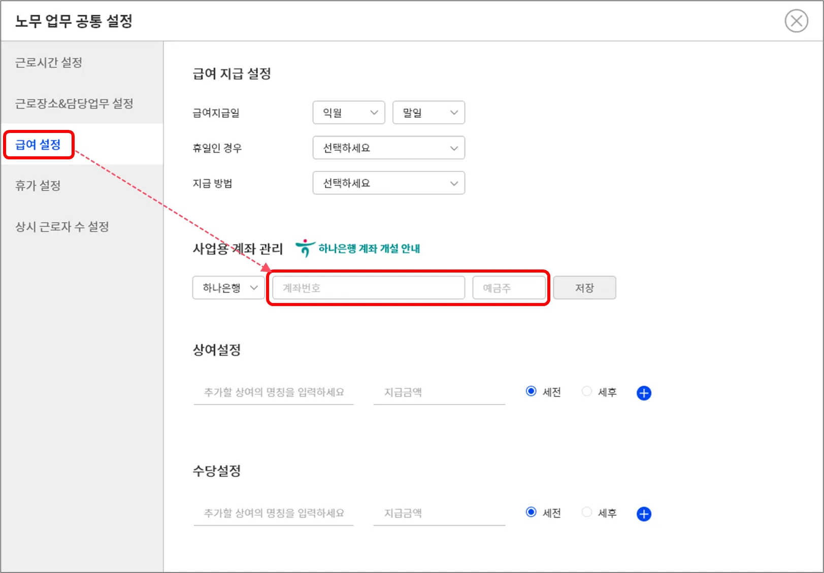 최초 1회, 사업주의 하나은행 계좌 정보 등록이 필요합니다.