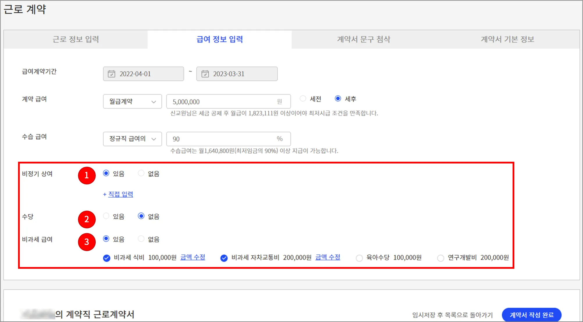 세금공제전(세전급여) / 세금공제후(네트제) 급여계약을 모두 지원합니다.