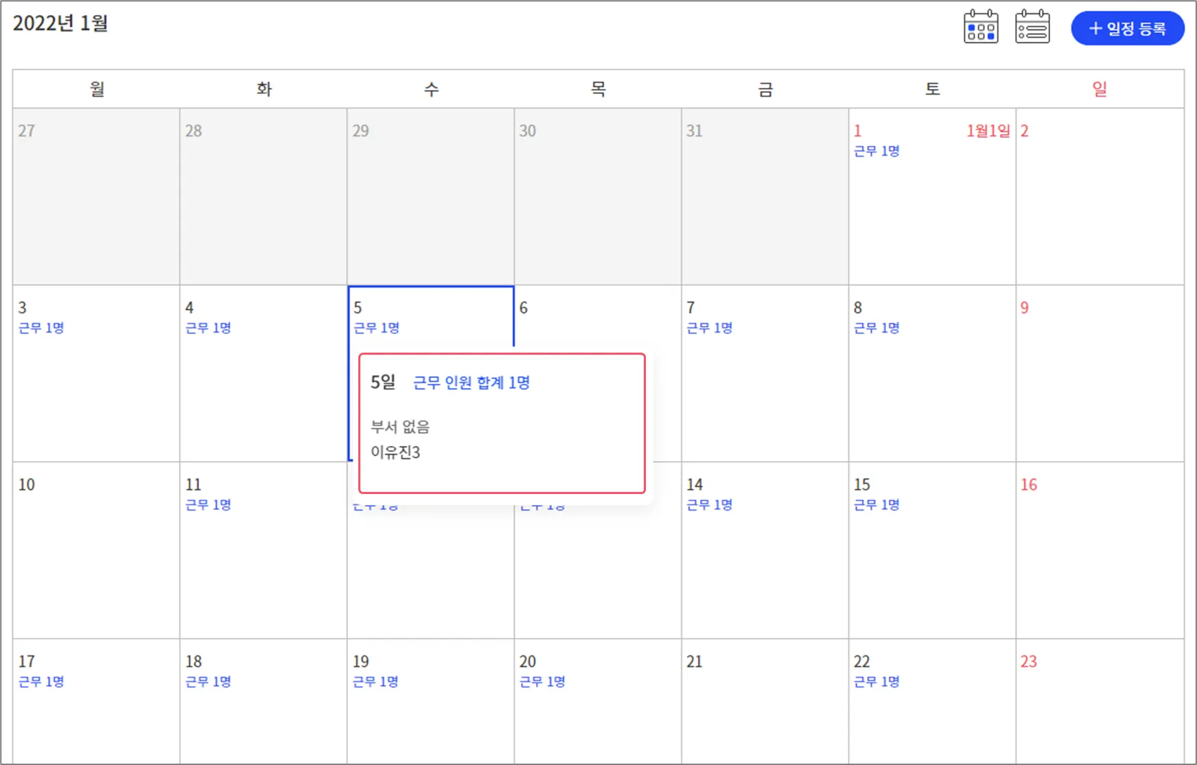 등록된 근무일은 캘린더에서 근무인원 카운트에서 확인됩니다.