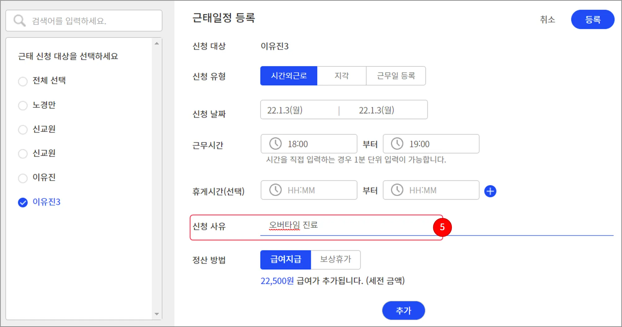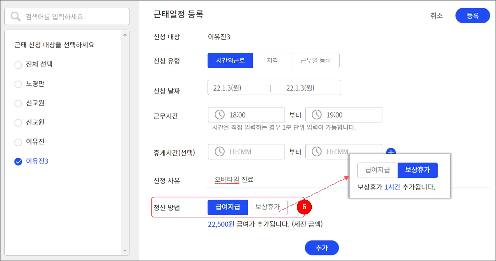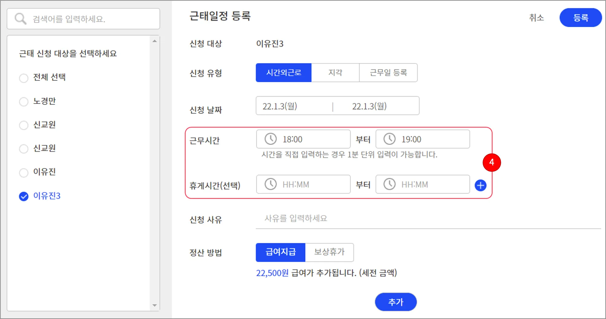 시간외근로를 등록할 근로자를 선택하세요. 여러 명을 선택할 수도 있습니다.