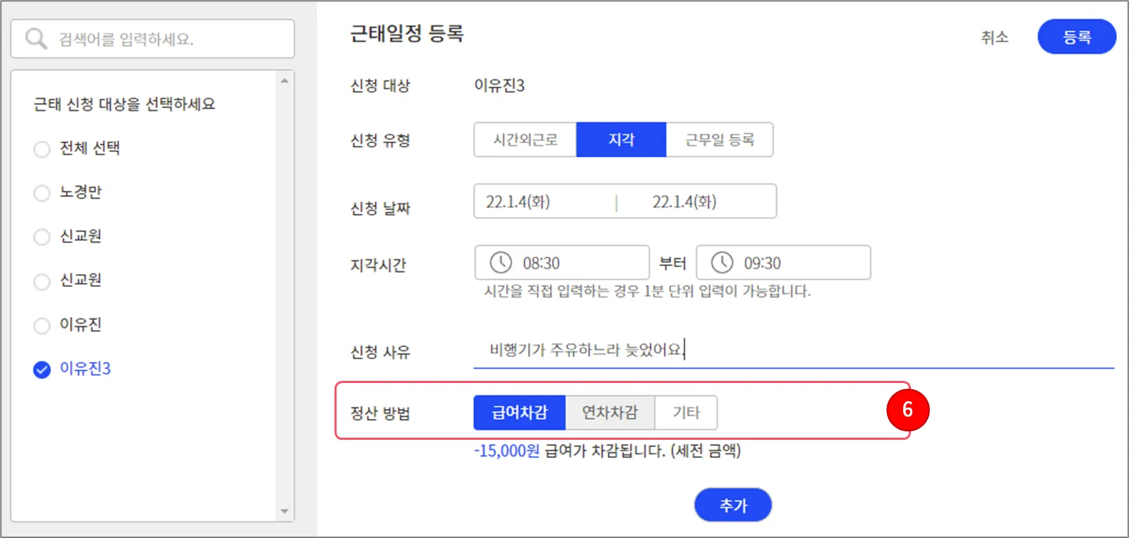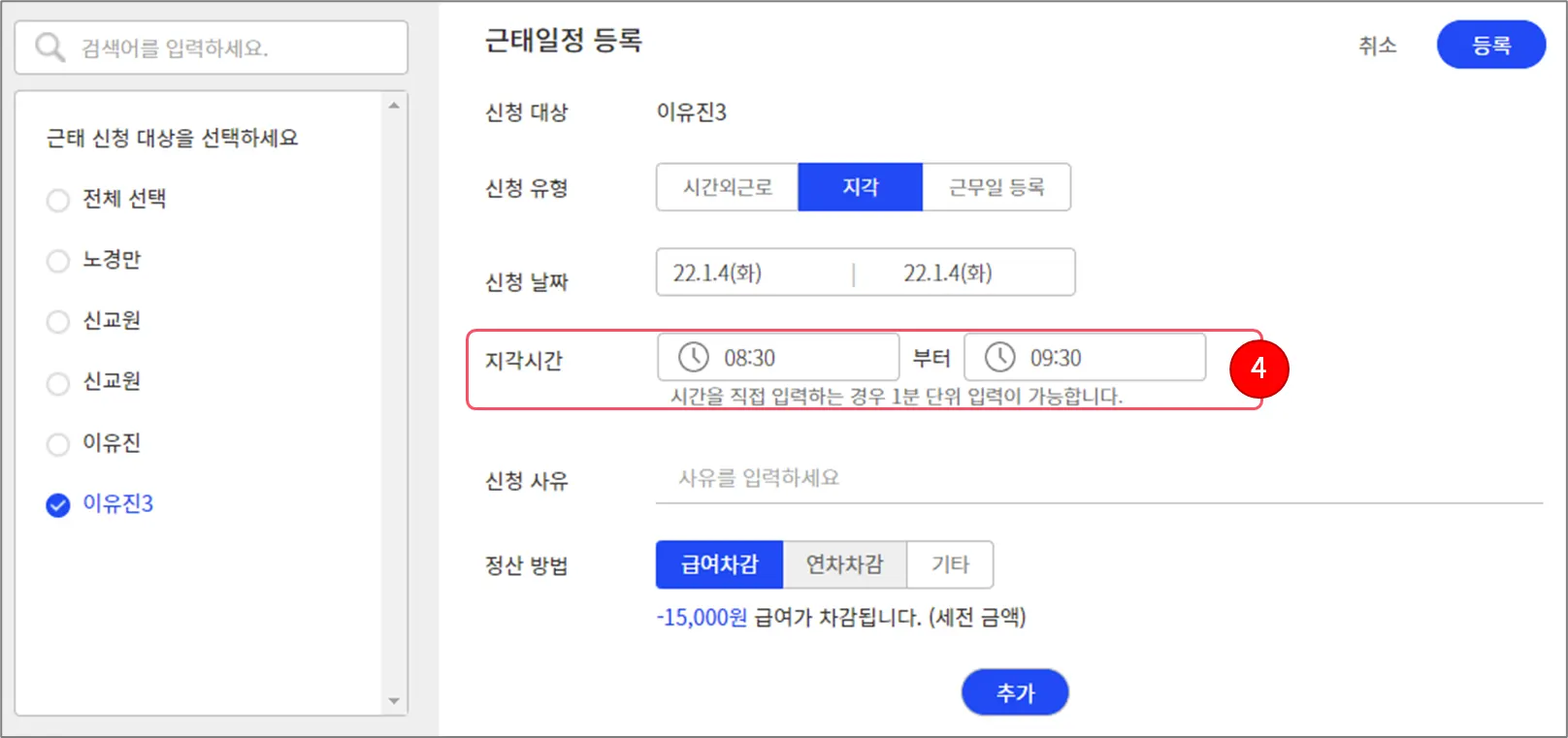지각을 등록할 근로자를 선택하세요. 여러 명을 선택할 수도 있습니다.