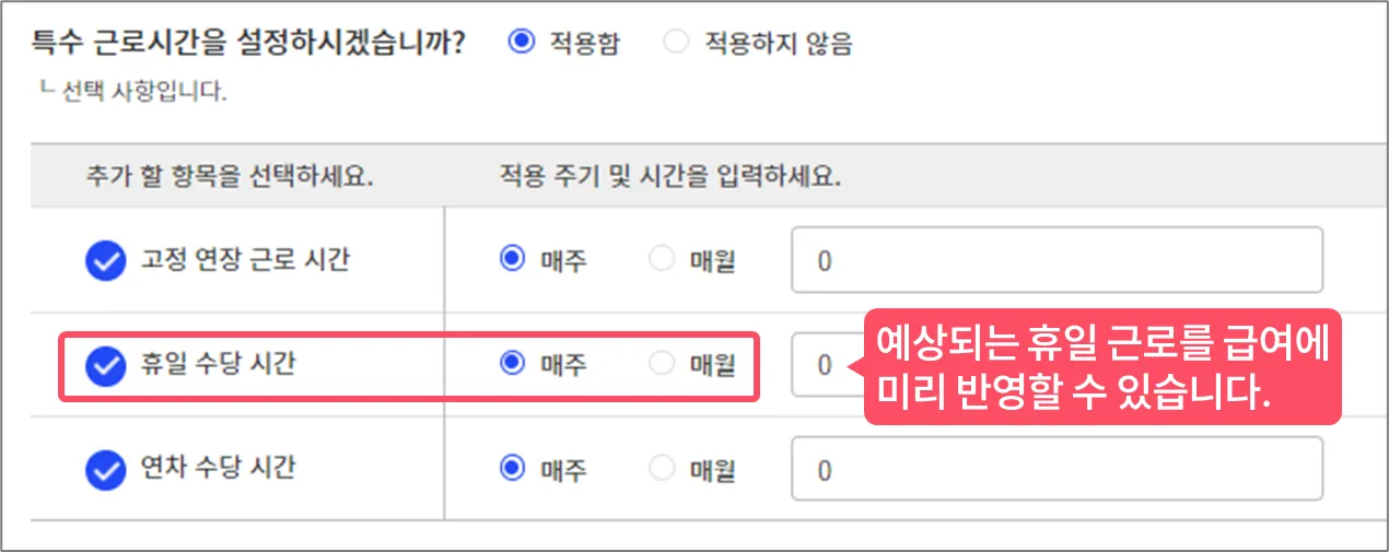 예상되는 휴일 근로 시간을 미리 근로계약에 반영할 수 있습니다.