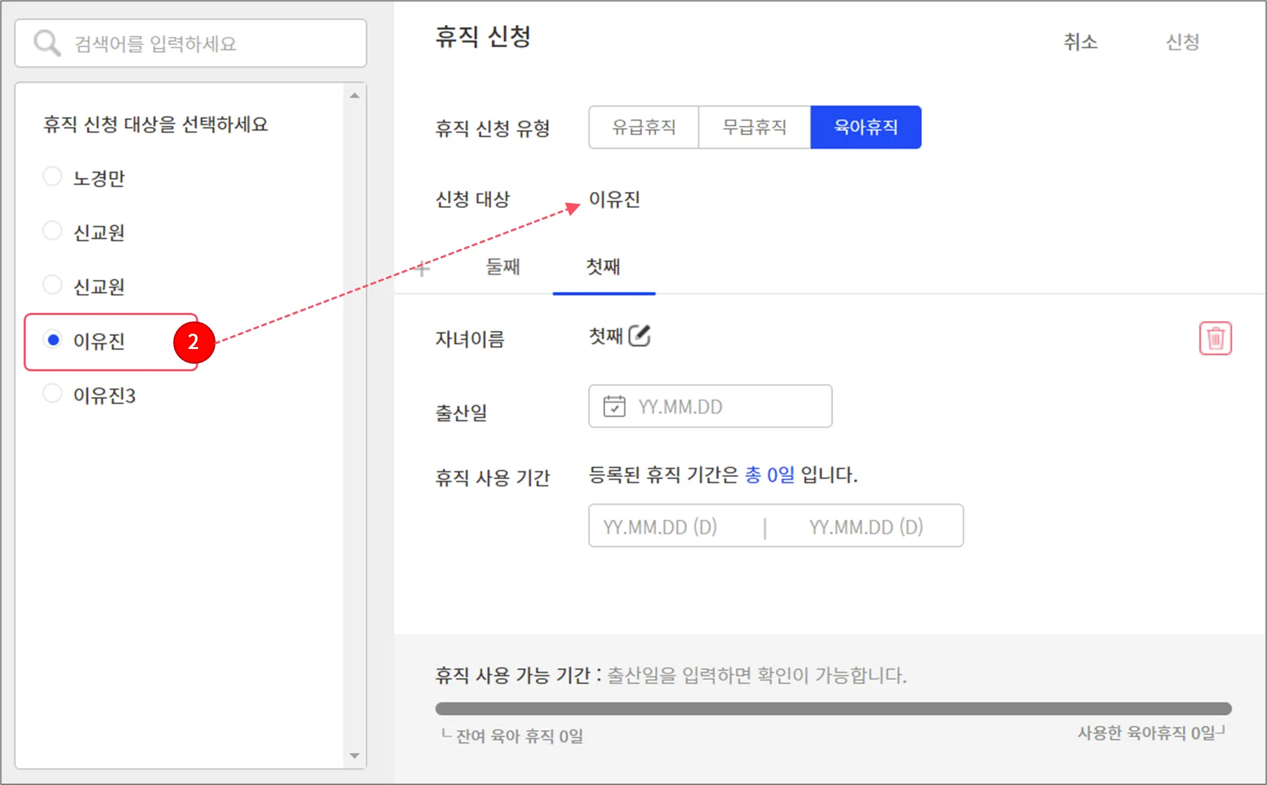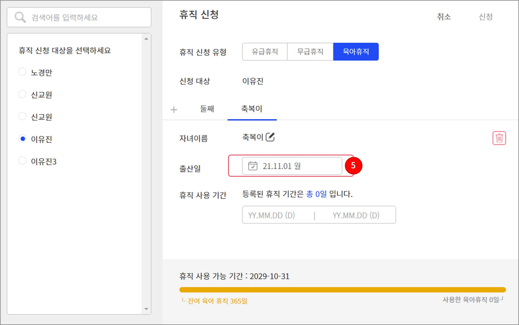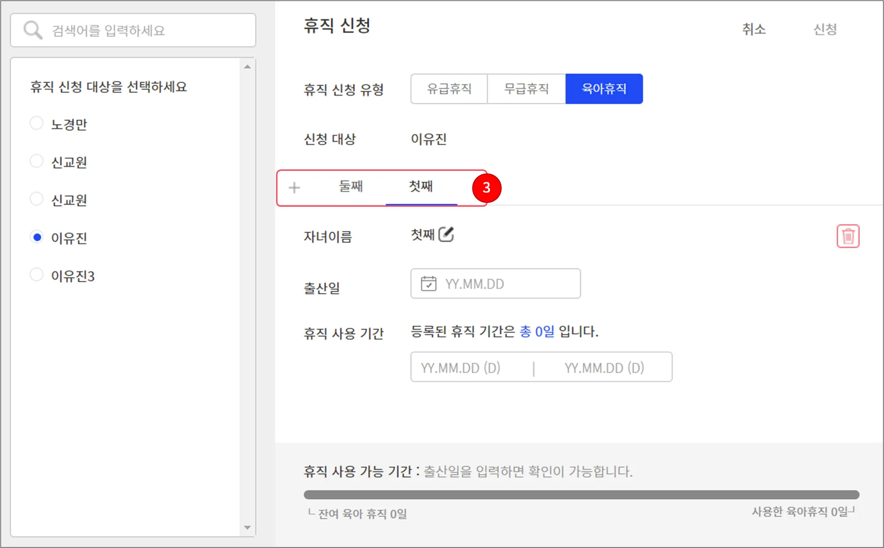 자녀의 출산일을 입력하면 휴직 사용 가능 기간이 표시됩니다.