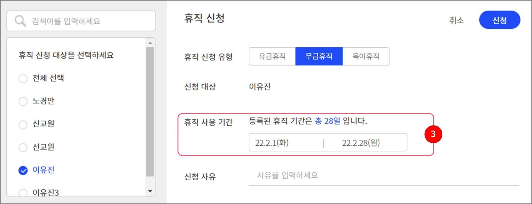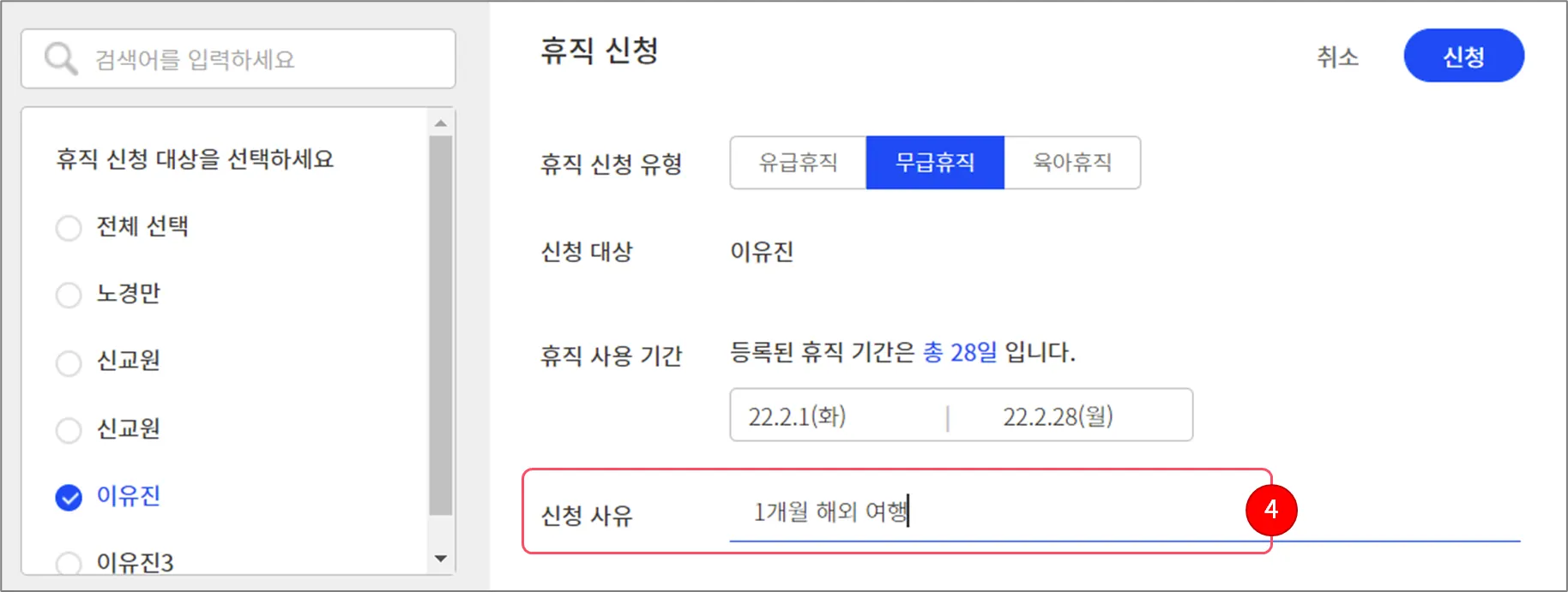 무급휴직을 등록할 근로자를 선택하세요. 여러 명을 선택할 수도 있습니다.