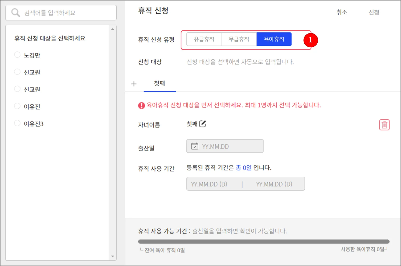 육아휴직을 등록할 근로자를 선택하세요. 육아휴직은 1명만 선택할 수 있습니다.