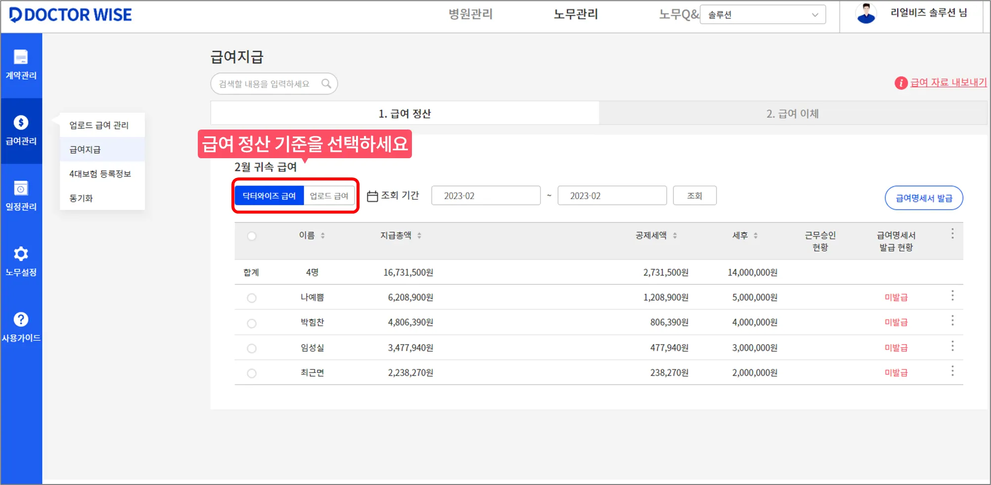 닥터와이즈 급여는 체결된 근로계약서 기준으로 자동 계산된 급여입니다.