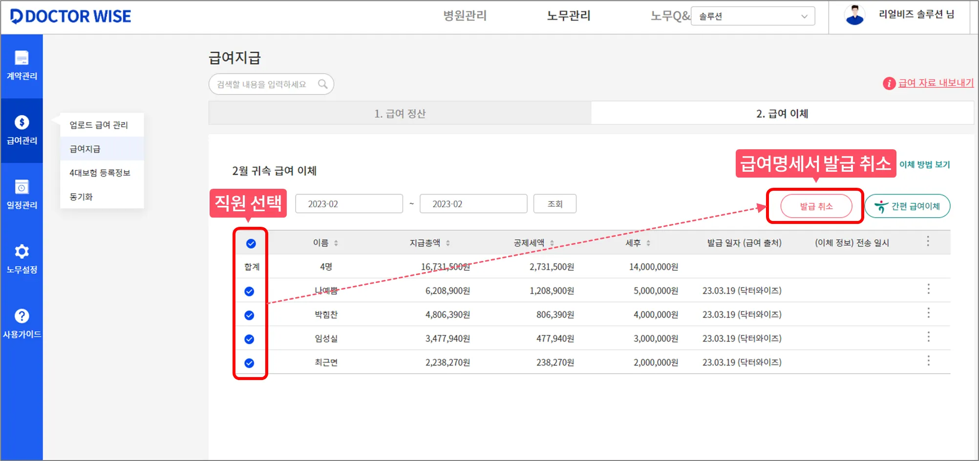 급여명세서 발급 취소는 2.급여 이체 화면에서 할 수 있습니다.