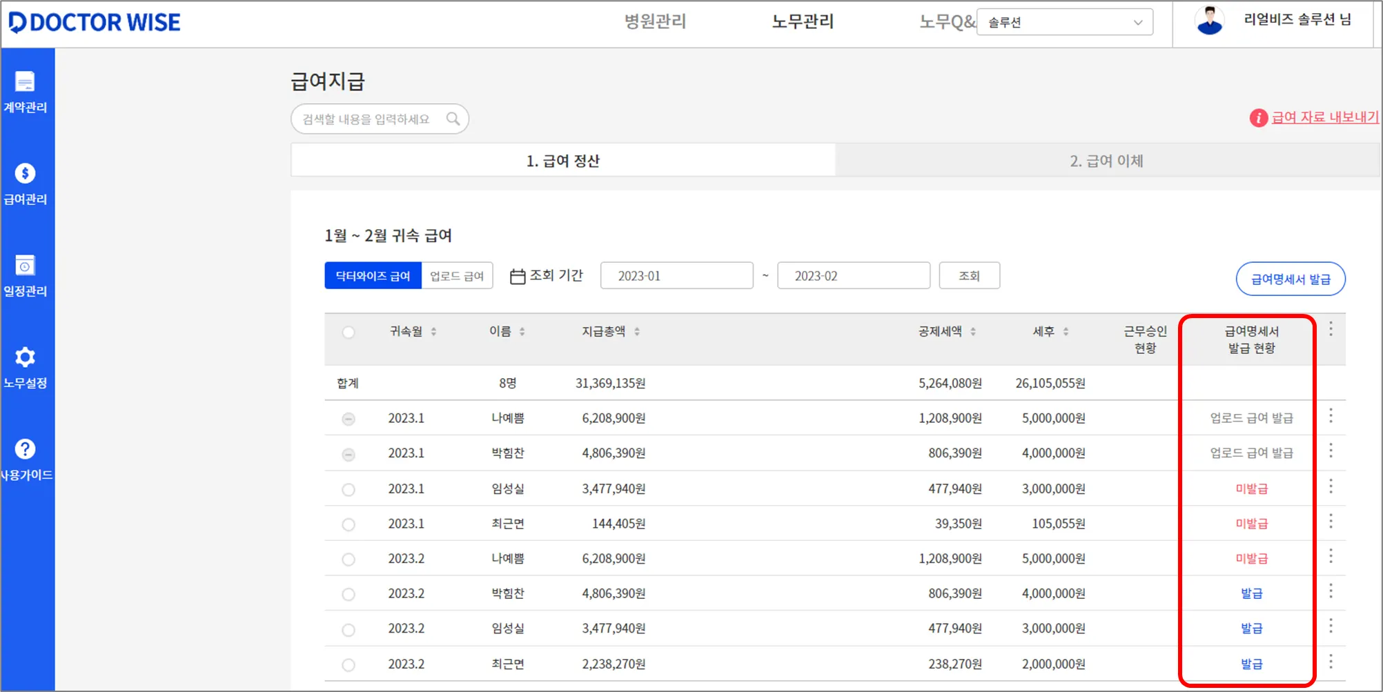 닥터와이즈 급여는 체결된 근로계약서 기준으로 자동 계산된 급여입니다.