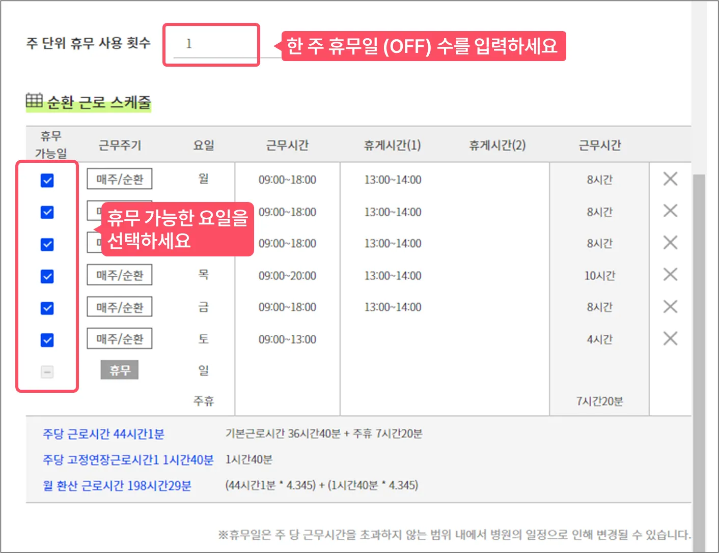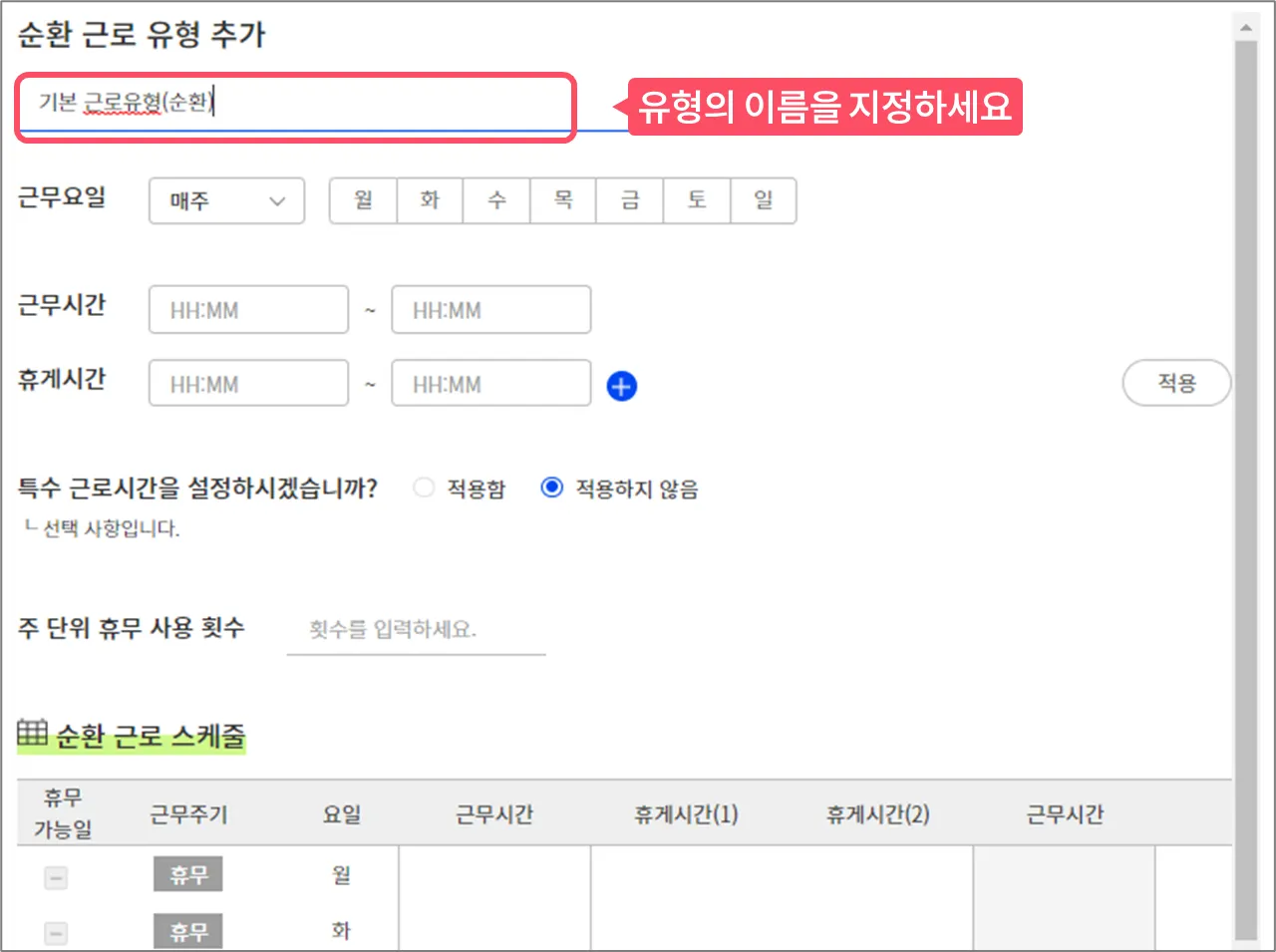 순환근무 유형에서는 모든 요일의 근무 일정을 입력하세요.