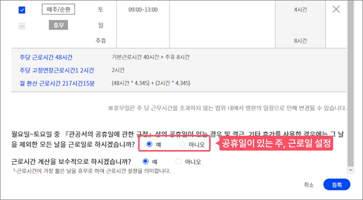 ‘아니오’를 선택하면 월~토요일 근로시간의 평균값을 휴무일 시간으로 설정합니다.